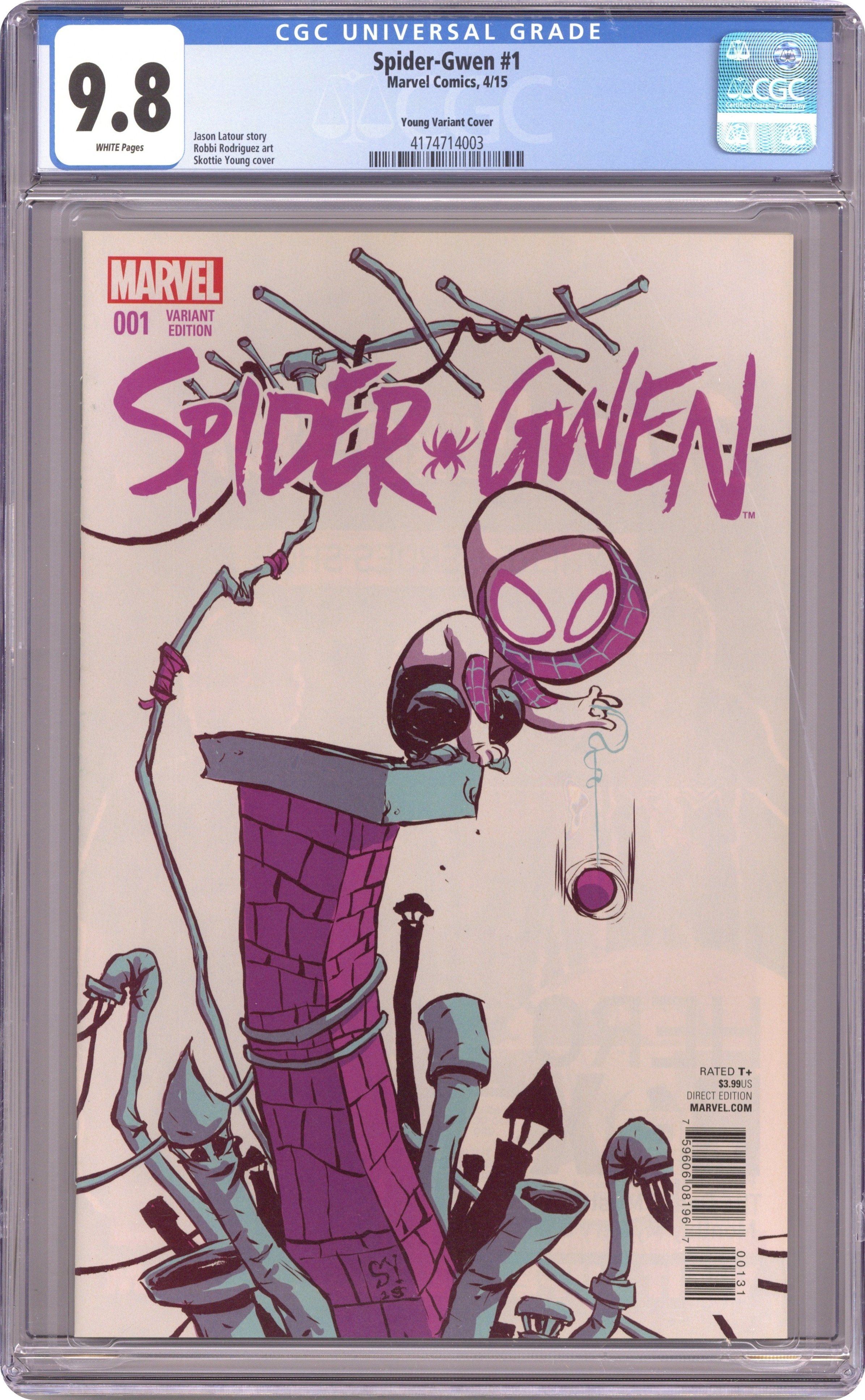 Written by Jason Latour. Art by Javier Rodriguez. Cover by Skottie Young. SPIDER-GWEN SPINS INTO HER OWN SERIES! BECAUSE YOU DEMANDED IT! The breakout hit of the biggest Spider-Event of the century is taking comic shops by storm this winter with her own new ongoing series - SPIDER-GWEN! Gwen Stacy is Spider-Woman, but you knew that already. What you DON'T know is what friends and foes are waiting for her in the aftermath of Spider-Verse! 28 pages, full color. Rated T+ Cover price $3.99. Grade: CGC 9.8 explanation of grade Condition: Used (collectible)