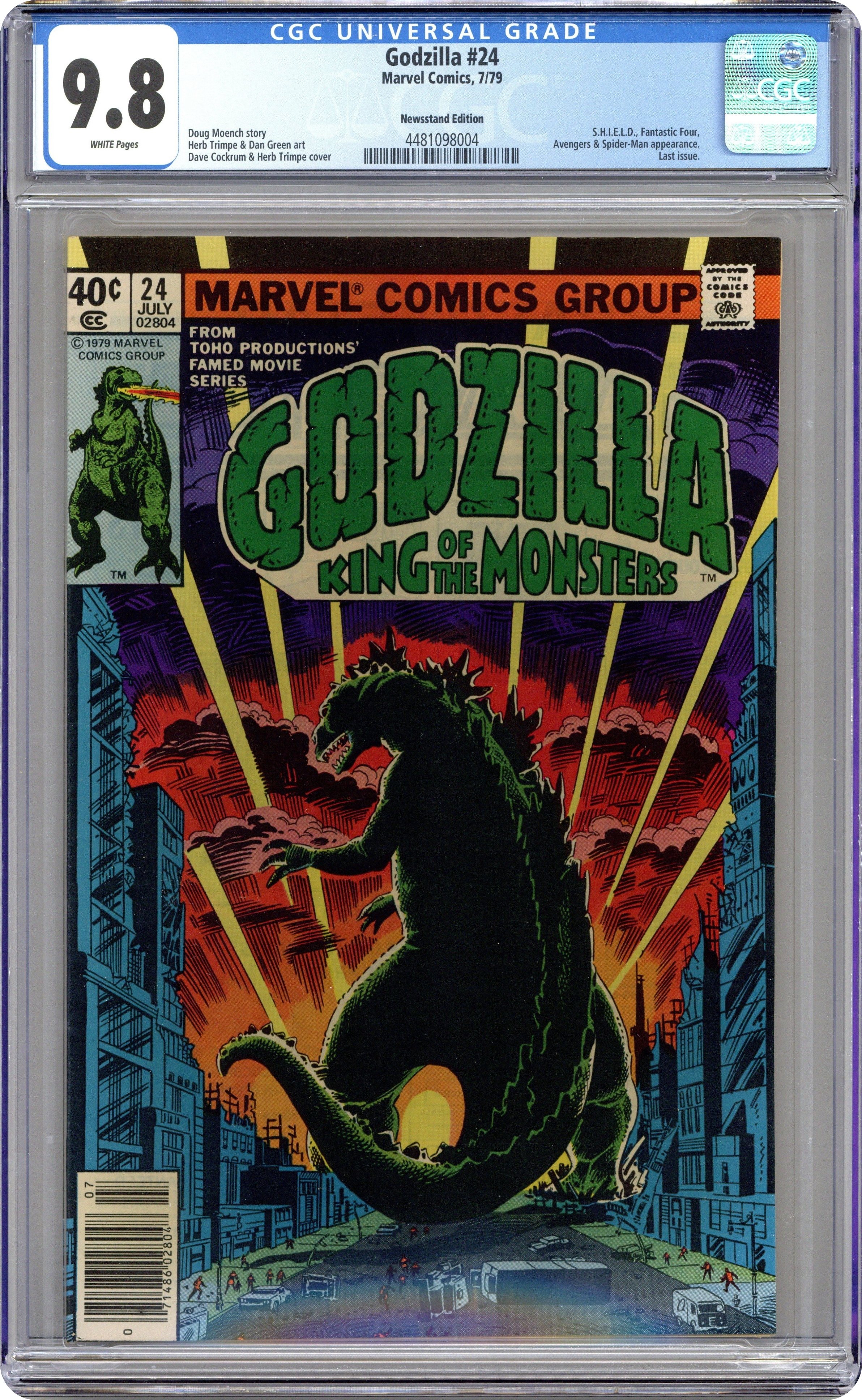 Newsstand Edition. Final issue. "And Lo, A Child Shall Lead Them!" Part 8 of 8. Guest-starring the Avengers and Fantastic Four. Spider-Man cameo. Story by Doug Moench. Art by Herb Trimpe and Dan Green. Godzilla's epic American Tour comes to an earth shattering end. Can the combined might of the Avengers, Fantastic Four, and S.H.I.E.L.D. hope to contain this titanic beast before he destroys the Big Apple, or will they have to finally use lethal force to bring the beast down? This is it, the final farewell for Godzilla, King of the Monsters. Cover price $0.40. Grade: CGC 9.8 explanation of grade Condition: Used (collectible)