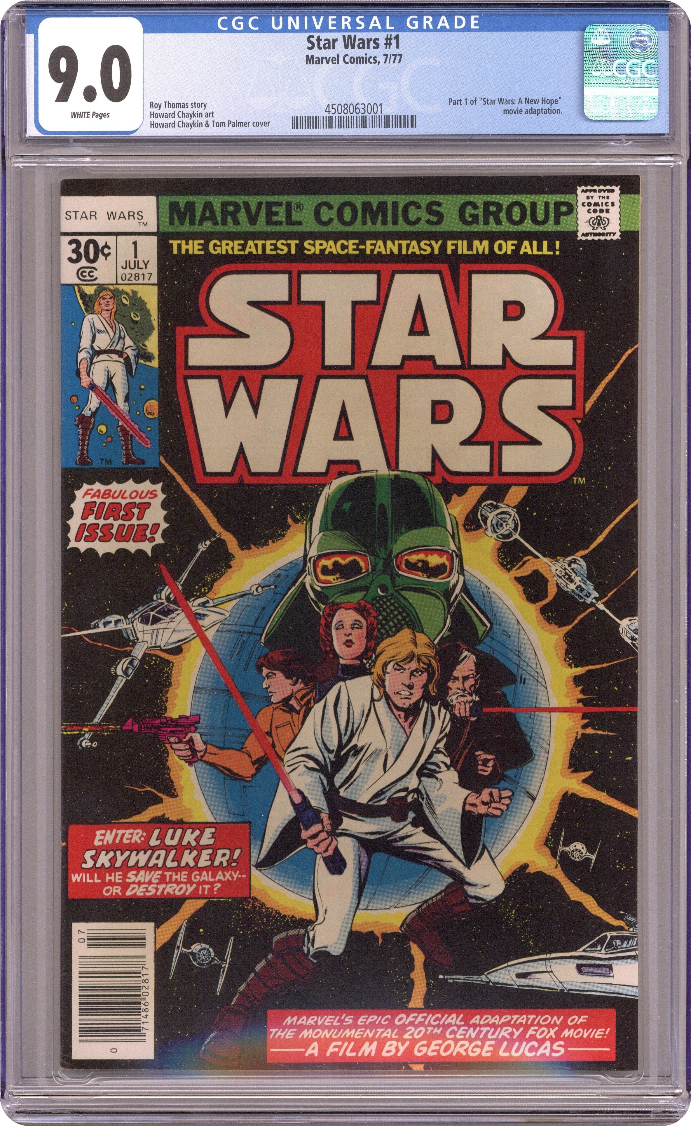 A Long time ago, in a galaxy far, far away...the galaxy is engrossed in an intergalactic civil war. A small band of freedom fighters led by Princess Leia opposes the evil Galactic Empire and steals the plans to their most destructive weapon, the Death Star. Darth Vader, the most feared name in the galaxy, will stop at nothing to recover those stolen plans and the location of the Rebel's secret base of operations. Now, it's up to farm boy Luke Skywalker and a motley band of heroes to save the Princess and the galaxy from the darkness that has engulfed it. Cover price $0.30. Grade: CGC 9.0 explanation of grade Condition: Used (collectible)