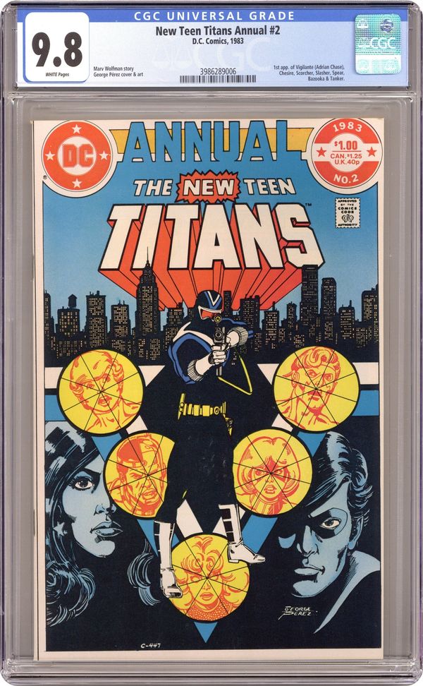 Direct Edition. "The Murder Machine!" 1st appearance of Vigilante. Off camera cameo by the Monitor. Story by Marv Wolfman and George Perez. Art by George Perez and Pablo Marcos. Continued from New Teen Titans (Tales of...) #34. Manhattan District Attorney Adrian Chase has been murdered. Mafioso Anthony Scarapelli is the man responsible. Chase was Robin's friend. This means it's time for the Titans to take on the New York mafia. However, the mysterious Monitor (see also Crisis on Infinite Earths #1) hires deadly assassins to take out the super-powered teenagers. Can even the Titans survive an encounter with the Scorcher, Spear, Bazooka, Slasher, Tanker, and Cheshire. Plus, introducing an enigmatic man known as the Vigilante who is judge, jury, and executioner all rolled up into one. 48 pages. Cover price $1.00. Grade: CGC 9.8 explanation of grade Condition: Used (collectible)