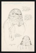 Though this design did not appear in the finished issue, this piece was likely drawn for Kirby's 1985 New Gods opus The Hunger Dogs, which saw Orion rescuing Tigra from Apokalips as Darkseid's empire crumbled around him. In the story Apokalips experiences a citizen's revolt with Darkseid makes a desperate run to find and kill Himon, the inventor of the Mother Box. When he makes it through the chaos and finds Himon, he is helping Orion load an injured Tigra into their getaway ship. Signed and dated '83 in the lower left of the piece. Pencil on DC Comics art board. 11 1/2" x 17".
