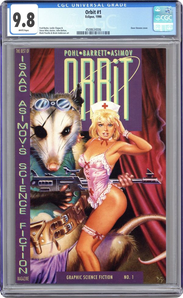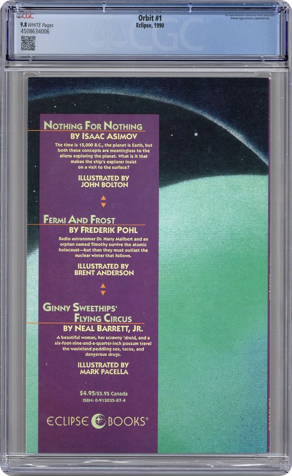Painted cover by Dave Stevens. "Nothing For Nothing," script by Isaac Asimov (original story) and Fred Burke (adaptation), art by John Bolton; Aliens try to trade with Cro-Magnon humans. "GINNY SWEETHIPS' FLYING CIRCUS," script by Neal Barrett, Jr. (original story), Leslie Clague (adaptation), and Steve Niles (adaptation), art by Mark Pacella; A woman, an accountant droid, and an anthropomorphic opossum try to survive the collapse of civilization by selling sex, tacos, and dangerous drugs. "Fermi and Frost," script by Frederik Pohl (original story) and Brent Eric Anderson (adaptation), art by Brent Eric Anderson; Refugees from World War III try to survive a nuclear winter in Iceland. Back cover illustration by John Bolton. 52 pgs., full color. $4.95. Cover price $4.95. Grade: CGC 9.8 explanation of grade Condition: Used (collectible)