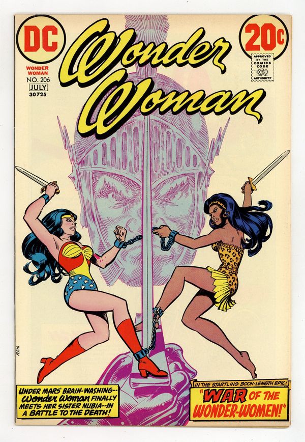 Cover by Nick Cardy. "War of the Wonder Women!", script by Cary Bates, pencils by Don Heck, inks by Vince Colletta; Wonder Woman learns untold facts about her origin: that a second statue of a child, created from black clay, was created by Queen Hippolyta at the same time as she was, and was also given life by Aphrodite, becoming Nubia, who was stolen from her cradle by Mars; Now Nubia has become the adult pupil of Mars, and is set against Wonder Woman just as Mars attacks Paradise Island. 36 pages, Full Color. Cover price $0.20. Grade: FN- 5.5 explanation of grade Condition: Used (collectible)