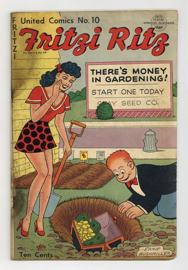 Ended Apr 8 2025 Winning Bid $1 Cover by Ernie Bushmiller. Stories and art by Ernie Bushmiller and Raeburn van Buren. The comic-strip adventures of aspiring model Fritzi Ritz and her boyfriend, the bumbling Phil Fumble. Fritzi tries to attract the attention of a newspaper photographer at the beach, in a strip that showcases Bushmiller's ability to draw beautiful women. Bathless Groggins gets into a boxing match with Banker Hagstone over $10,000 in stock shares, in an Abbie an' Slats strip with nice art by Raeburn van Buren. Fritzi Ritz; Abbie an' Slats; Stamp Tips. 32 pages, Full Color. Cover price $0.10. Grade: PR 0.5 explanation of grade Condition: Used (collectible)
