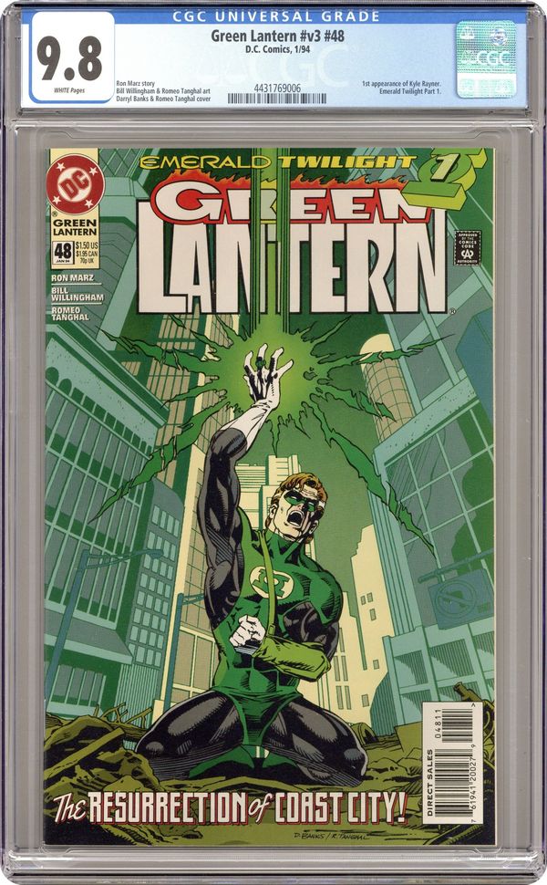 Ends Dec 8 8:30 PM CST Bid History 6 bids Current Bid $39 Your Secret Max Bid If you'd like to bid, please log in or register. Direct Edition. Emerald Twilight: Part 1 of 3. "The Past!" Story by Ron Marz. Art by Bill Willingham, Robert Campanella, and Romeo Tanghal. It's the beginning of the end for Hal Jordan. In this seminal chapter in the life of Green Lantern, Hal returns to ground zero and attempts to use his Power Ring to resurrect the devastated Coast City. But what happens if he doesn't have enough power? Don't miss the most unexpected turn in the life of Hal Jordan as DC counts down to a very special 50th issue. NOTE: 1st appearance of Kyle Rayner. Cover price $1.50. Grade: CGC 9.8 explanation of grade Condition: Used (collectible)
