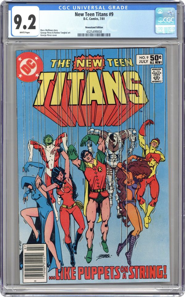 Ended Jun 16 2025 Winning Bid $36 Newsstand Edition. The Puppeteer pulls the Titans' strings in a bid to gain control of Project: Promethium in "Like Puppets On A String!" Script by Marv Wolfman, pencils by George Perez, inks by Romeo Tanghal. Deathstroke cameo. Perez cover. Cover price $0.50. Grade: CGC 9.2 explanation of grade Condition: Used (collectible)