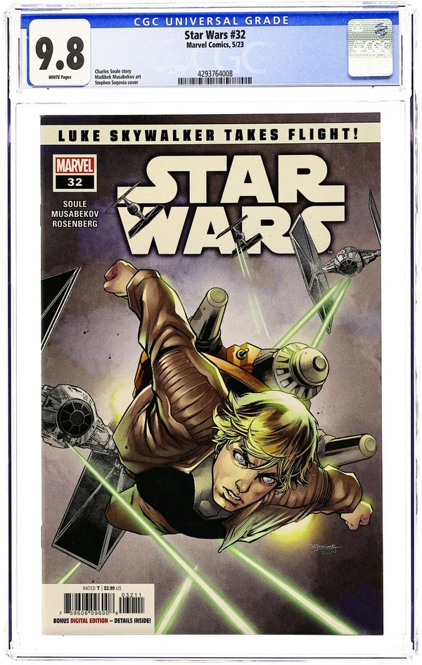 Written by Charles Soule. Art by Madibek Musabekov. Cover by Stephen Segovia. THE FORCE IS BROKEN? The efforts of Lady Qi'ra and Crimson Dawn to destroy the Sith have sent deep ripples running through the Force, disrupting Luke Skywalker's connection to the deep powers of the galaxy. How far will he go to find what he has lost? 28 pages, full color. Rated T Cover price $3.99. Grade: CGC 9.8 explanation of grade Condition: Used (collectible)