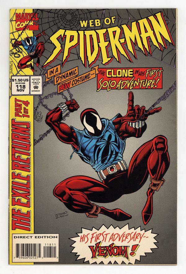 First Printing. Direct Edition. "Exiles Return Part 1 of 4: Memories" Written by Terry Kavanagh. Pencils by Steve Butle. Inks by Randy Emberlin. Venom and Clone appear. Note: First appearance of Ben Reilly as the Scarlet Spider. Cover price $1.50. Grade: VG/FN 5.0 explanation of grade Condition: Used (collectible)