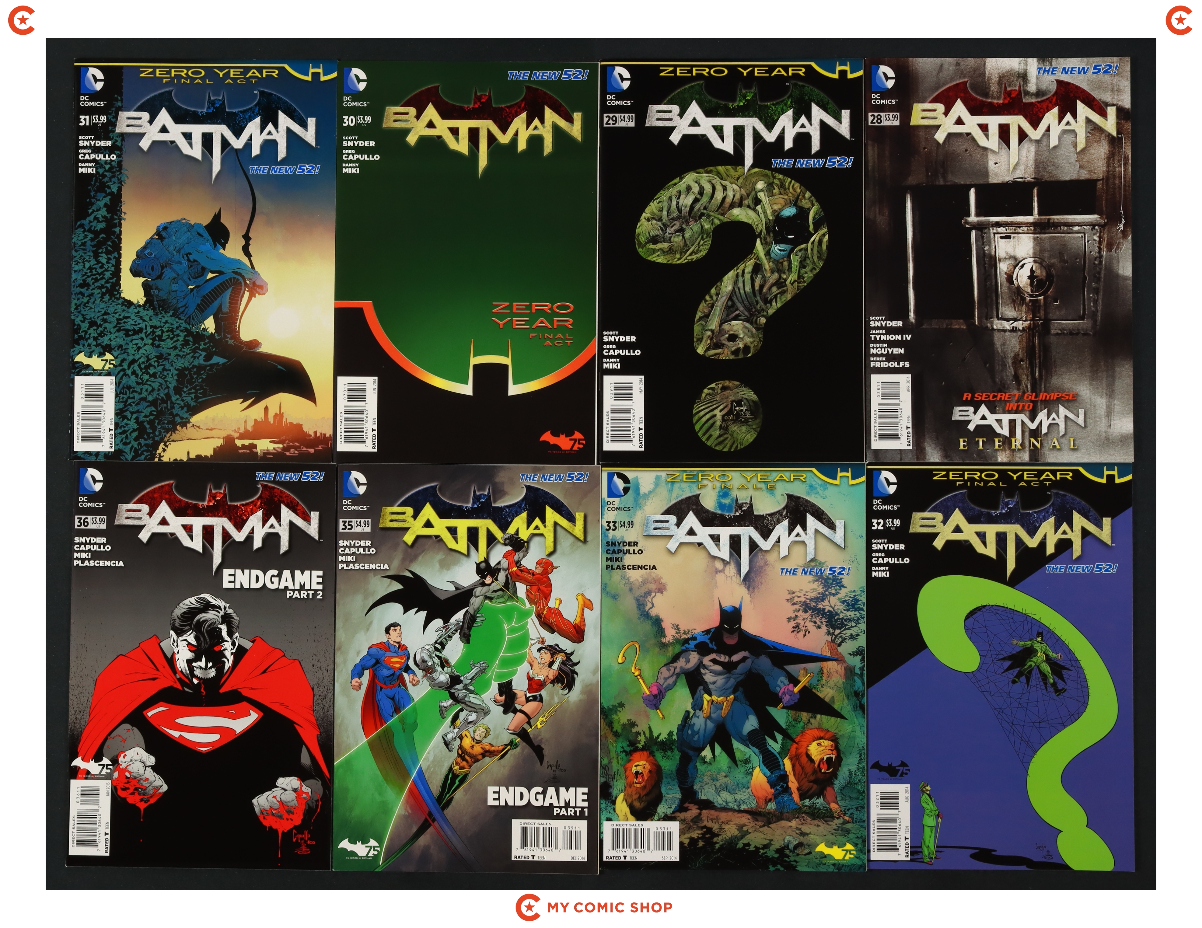 Issues 28A-33A, 35A, 36A, 38A-40A of Batman (2011 2nd Series). Most will grade in the VF to NM range.