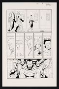 While Mark and Eve adjust to their new lives off-planet, things are NOT going well on earth. Rex (formerly Robot) has taken over the world with ruthless efficiency and imprisoned almost all of the heroes including the newly captured Maximortal. Wouldn't count the heroes out just yet though! Signed by Ottley in top margin. Pencils are over printed roughs on art board, inks are over printed pencils on art board. Both measure 11" x 17".