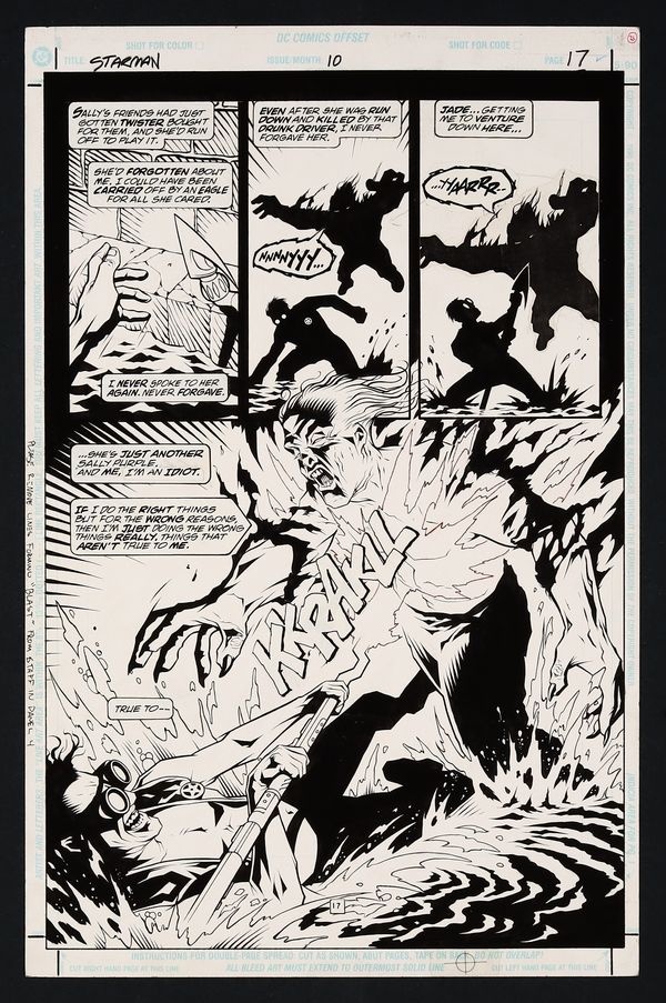 While grappling with the undead behemoth known as Solomon Grundy in the sewers of Opal City, Jack Knight is on the ropes after losing his Cosmic Staff in the chaos. Thankfully he's able to reach it in time to deliver a knockout blow in this beautiful half-splash! Pencil and ink on DC Comics art board. 11" x 17". NOTE: The Solomon Grundy silhouette in the third panel is a pasted in stat.