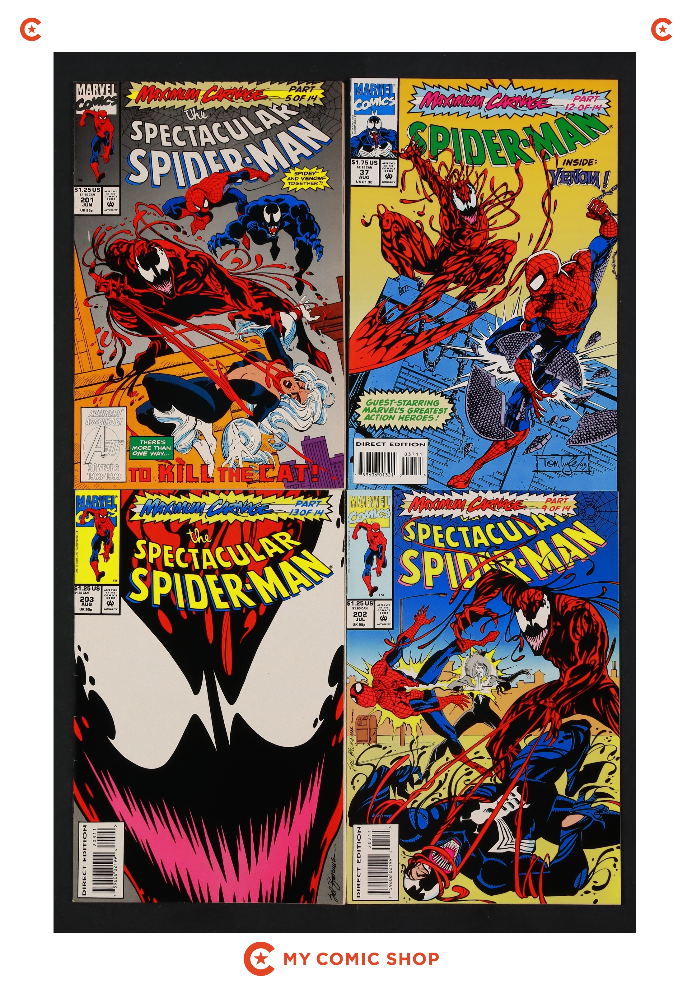 Issues 1D and 2 of Spider-Man Unlimited (1993 1st Series); 101, 102D, and 103D of Web of Spider-Man (1985 1st Series); 378D-380D of Amazing Spider-Man (1963 1st Series); 35, 36D, and 37 of Spider-Man (1990 Marvel); and 201-203 of Spectacular Spider-Man (1976 1st Series). Most will grade in the VF to FN range.