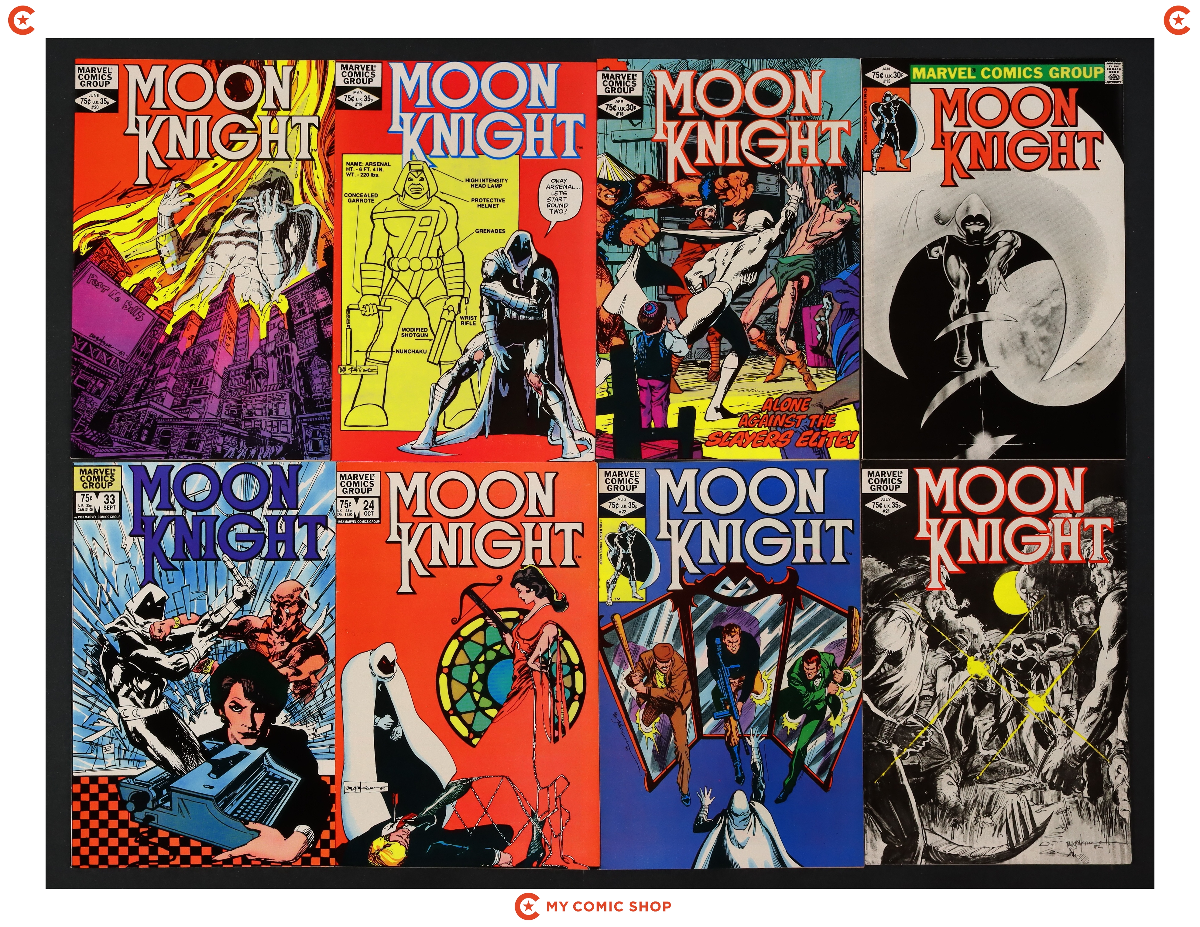 Issues 15, 18-22, 24, 33, and 35-37 of Moon Knight (1980 1st Series). Most will grade in the VF to FN range.