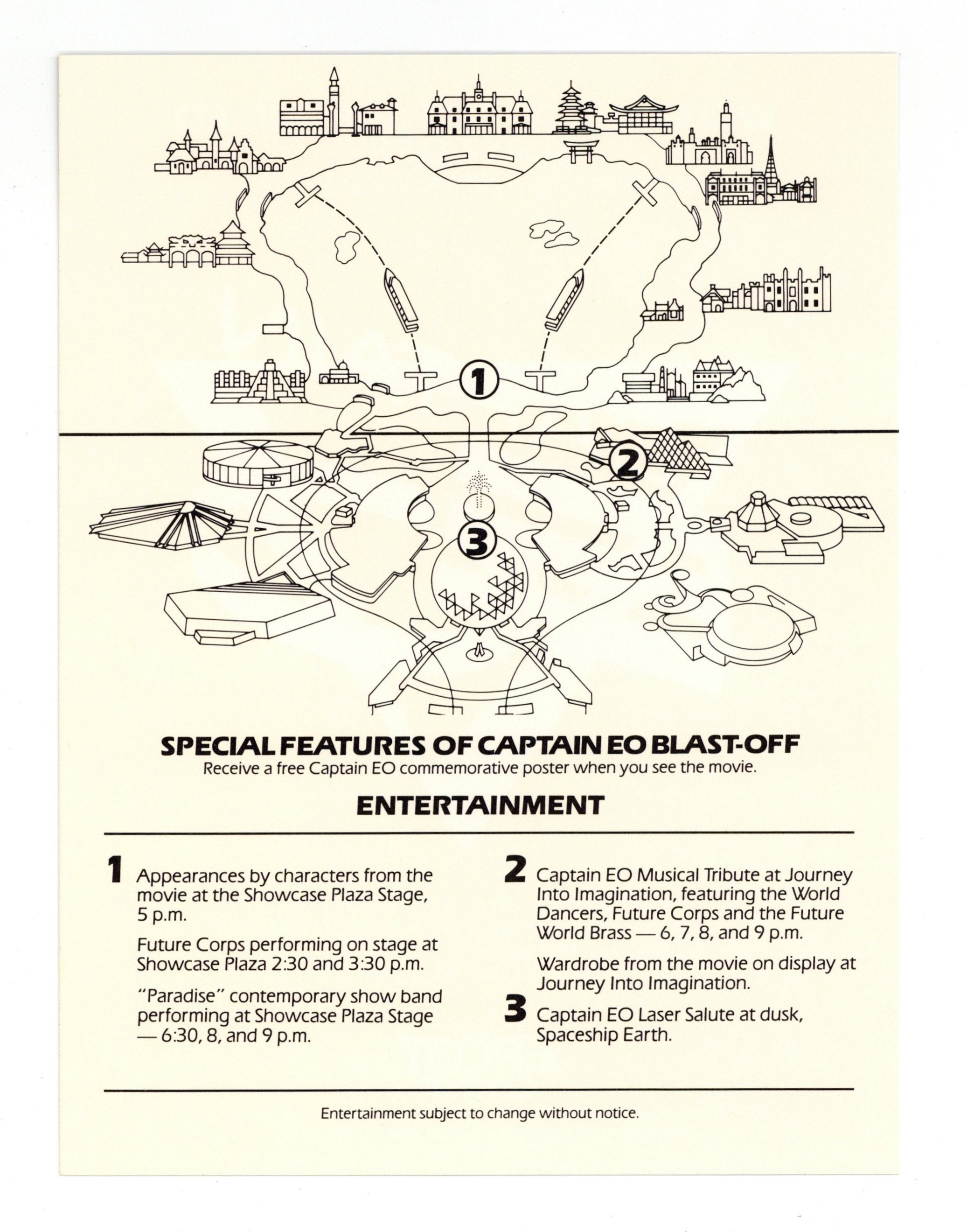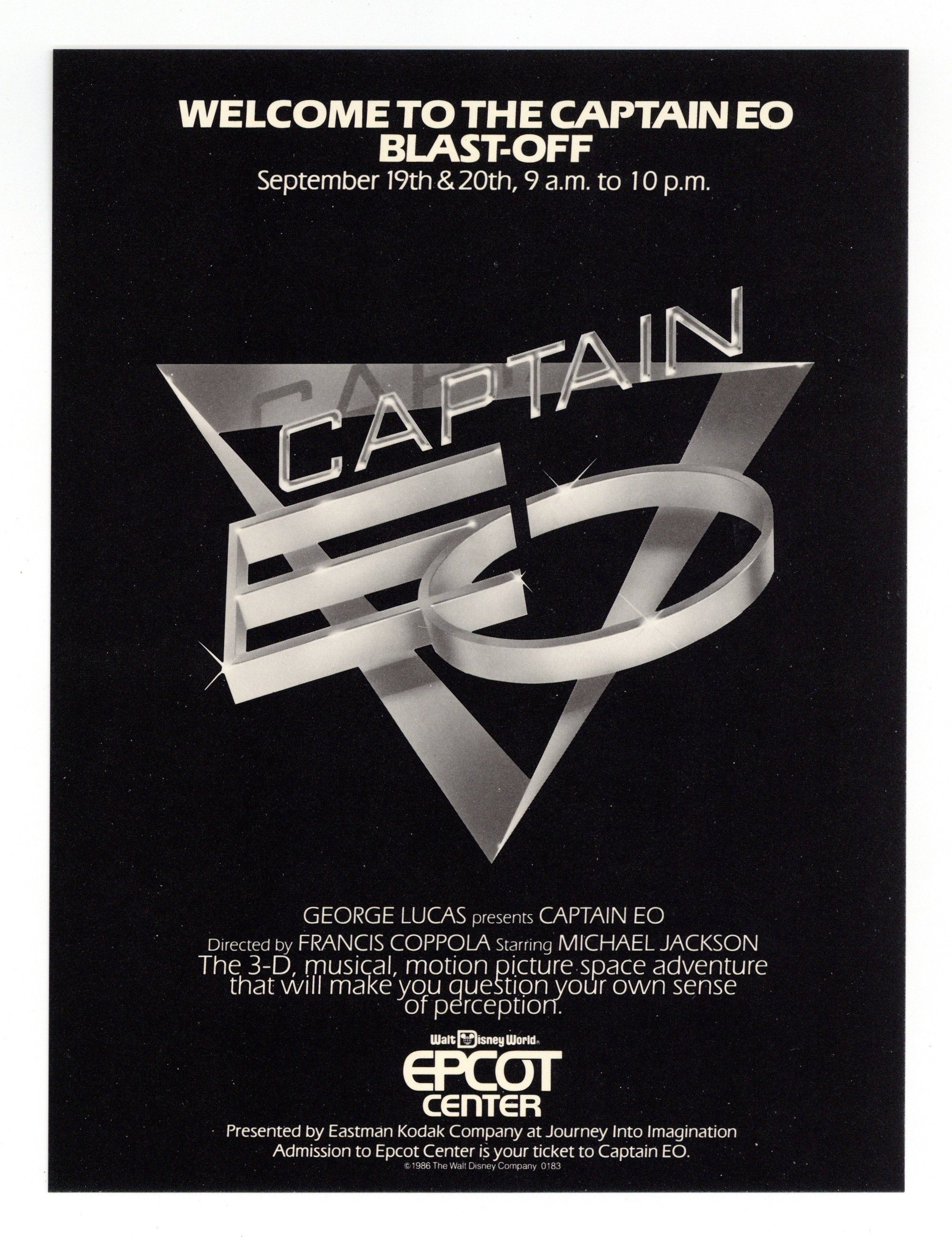 A massive creative undertaking, Disney's 4D entertainment extravaganza certainly warranted a massive premiere event. These handbills, given out for just two days at Walt Disney World in Florida, advertised the event which included several live performances and a laser show projected on the iconic Spaceship Earth building in Epcot center. High quality print on heavy stock. 6" x 8".