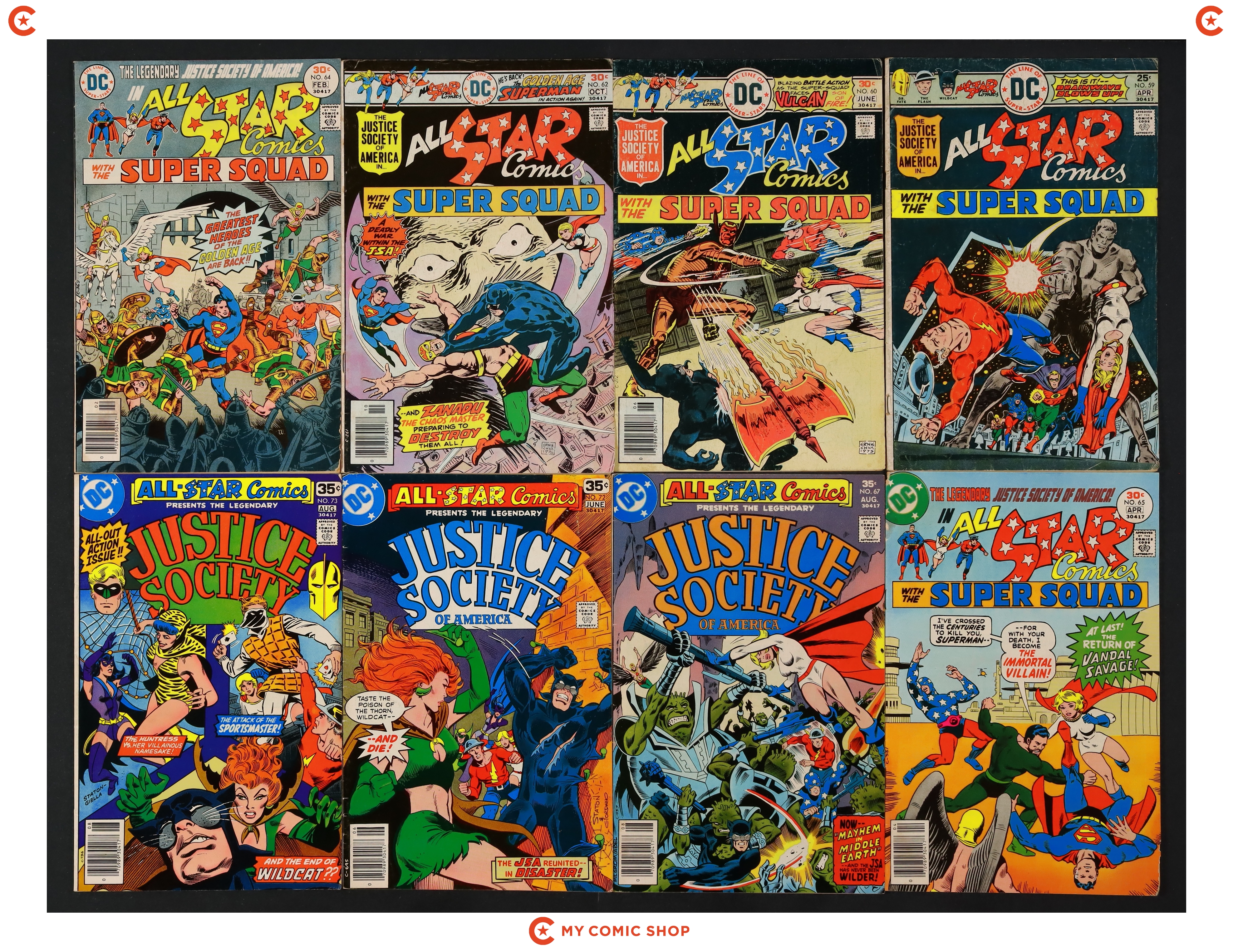 Issues 59, 60, 62, 64, 65, 67, 72, 73 of All Star Comics (1940-1978). Most will grade in the GD to VG+ range.