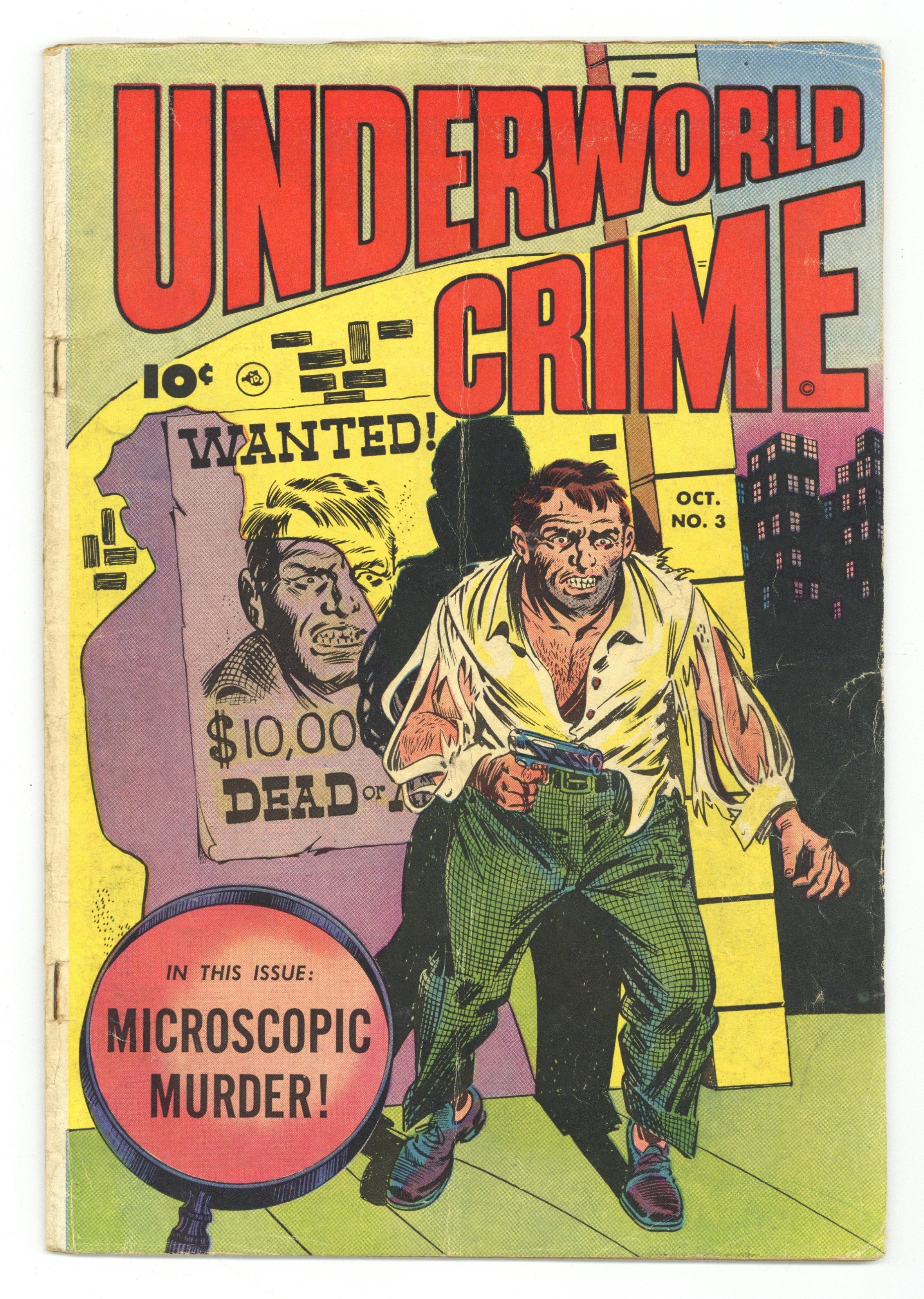 Stories and art by Maurice Gutwirth and Rod Reed. Classic pre-Code crime comics from Fawcett. Chemist Henry wants to see if he can commit the perfect crime using acid, in a story that calls its main character "Henry Holmes," a possible reference to the infamous serial killer. When gangsters get involved in the gambling over college sports, it's not long before the athletes themselves are targeted by the Mob. Shot by mobster Tiger Jack, gunsel Marty survives, and sets out to get revenge on Jack by assembling a gang of "kill-happy morons who'll laugh at bullets." Microscopic Murder; The Fixer; Mink Murder Case; Hijacker. 32 pages, Full Color. Cover price $0.10. Grade: GD/VG 3.0 explanation of grade Condition: Used (collectible)