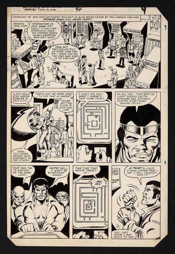 Luke Cage and Danny Rand, the Heroes for Hire, are hot on the trail of a missing millionaire. Of course, Luke's just gotta finish ooooone more level before they get to work! A genuinely delightful page from the era when video game fever first swept the nation. Also of note, the game that's frustrating Luke to no end is named X-Factor! Pencil and ink on Marvel Comics art board. 10 3/4" x 16".