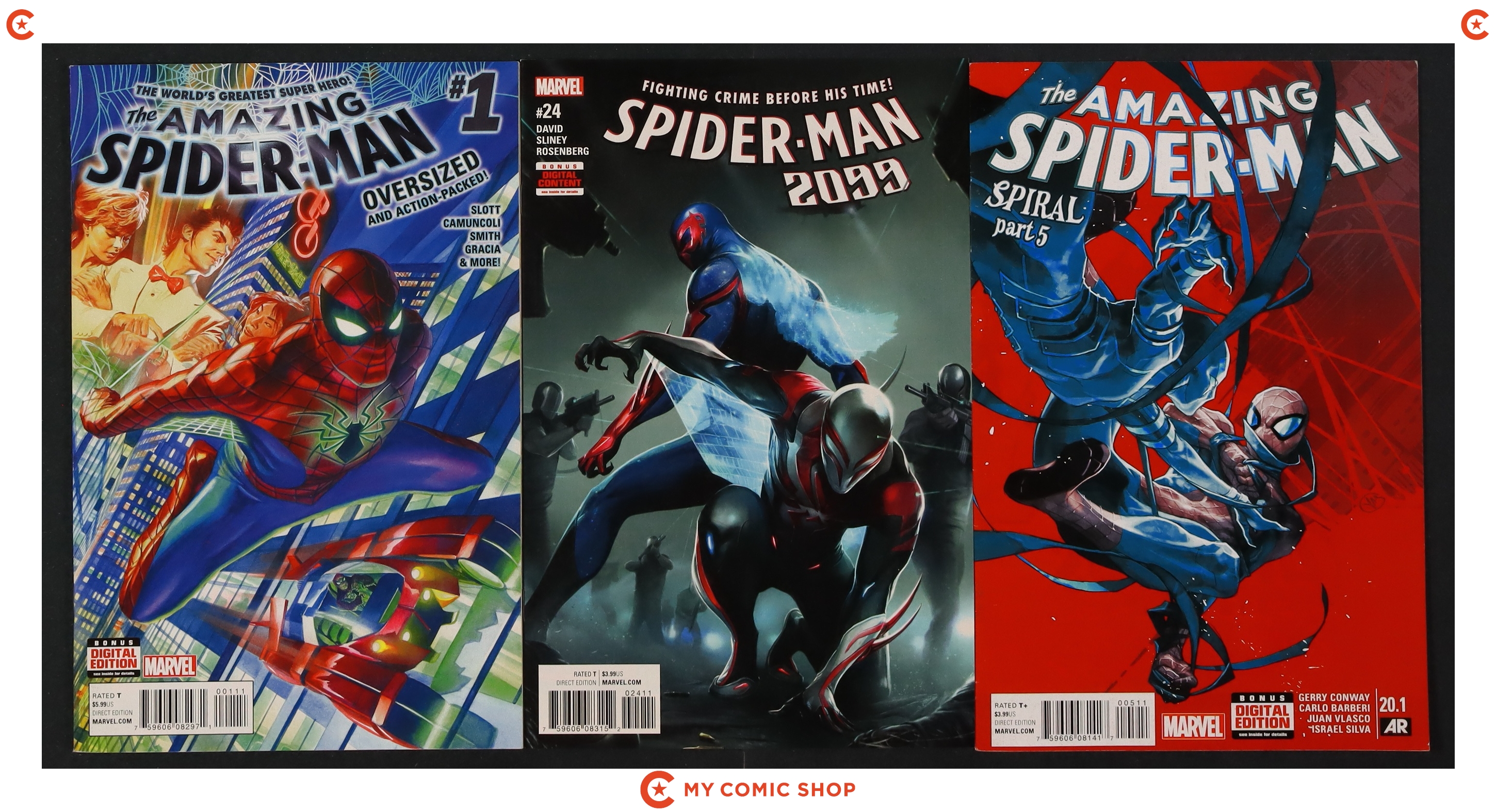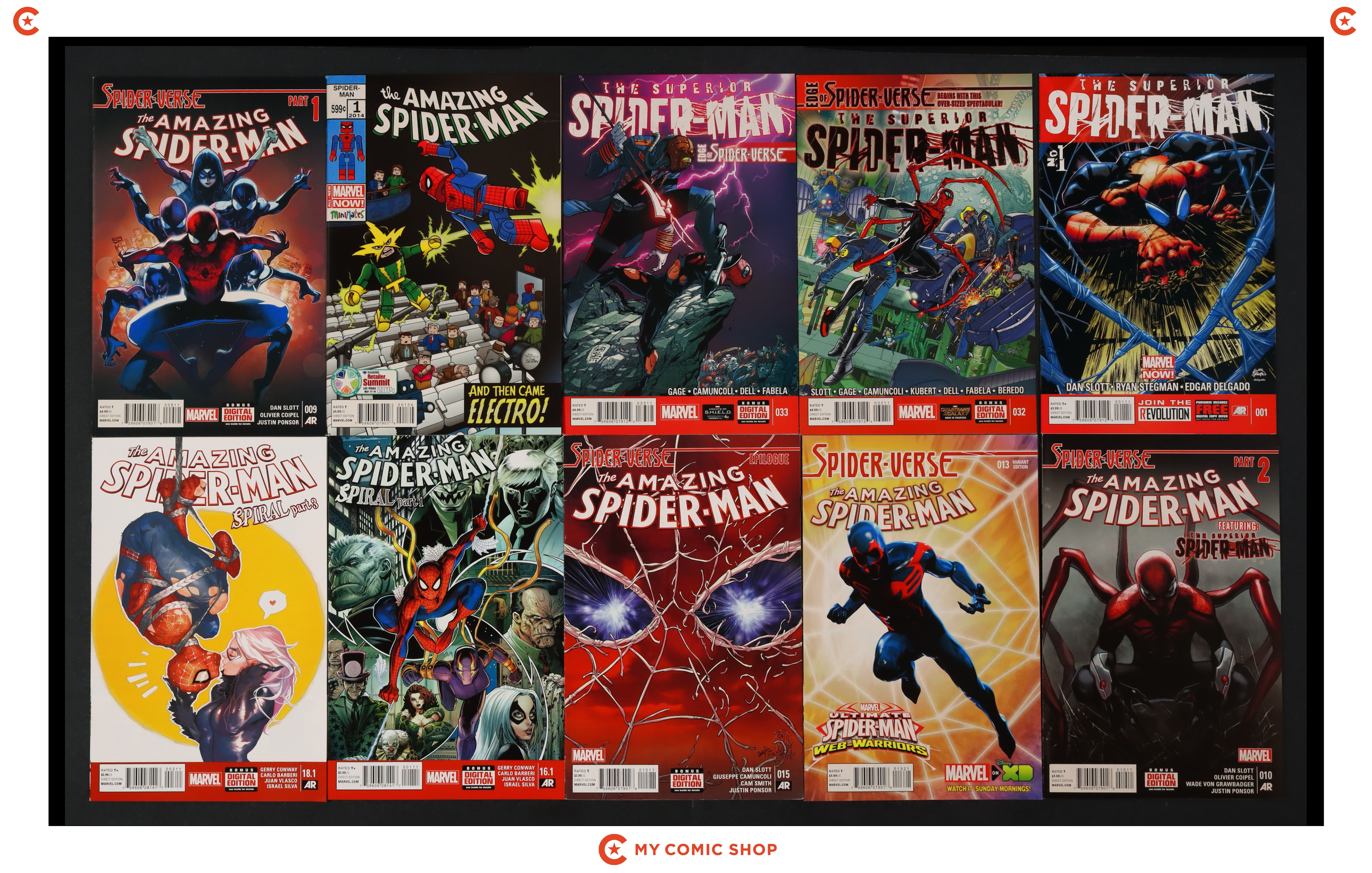 Issues 1A, 32A, 33A of Superior Spider-Man (2013 Marvel NOW); 1J, 9A, 10A, 13D, 15A, 16.1A, 18.1A, 20.1A of Amazing Spider-Man (2014 3rd Series); Spider-Man 2099 (2015 3rd Series) 24; and Amazing Spider-Man (2015 4th Series) 1A. Most will grade in the VF+ to NM range.