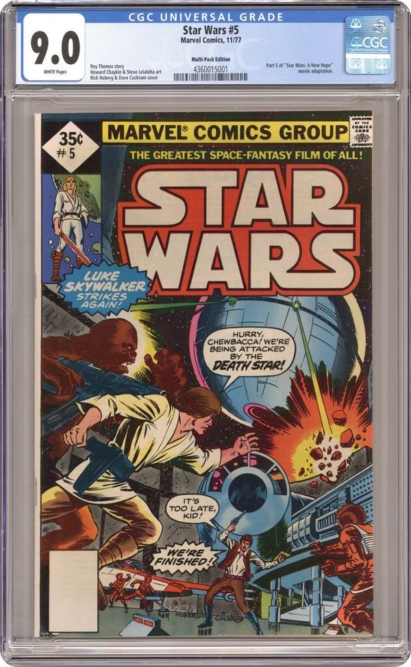 1st printing. Whitman Diamond Edition. A New Hope: Part 5 of 6. "Lo, the Moons of Yavin!" Based on the screenplay by George Lucas. Adapted by Roy Thomas. Art by Howard Chaykin and Steve Leialoha. Luke does not have long to mourn the loss of Ben Kenobi as the Millennium Falcon is attacked from all sides by deadly Tie-Fighters. Even if these Rebel heroes do survive this latest attack, the Empire knows the location of the Rebel's secret headquarters. They don't have long before the Death Star, a space station with the power to destroy planets, delivers the killing blow to the rebellion once and for all. Cover price $0.35. Grade: CGC 9.0 explanation of grade Condition: Used (collectible)