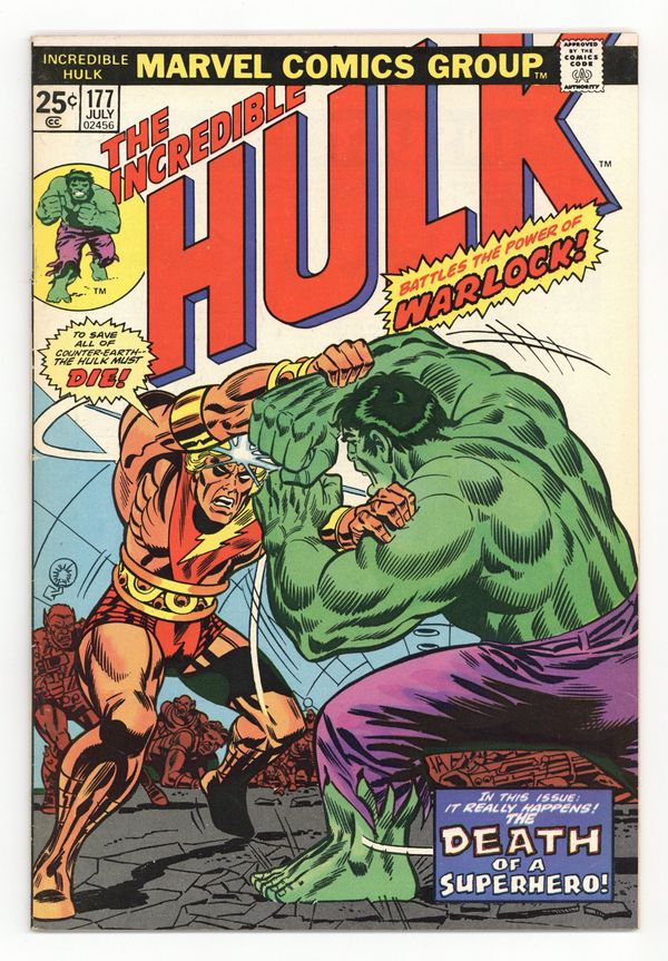 Cover pencils by Herb Trimpe, inks by Frank Giacoia. Peril of the Plural Planet! starring Adam Warlock, Man-Beast and his New Men, and the Hulk, script by Roy Thomas and Gerry Conway, pencils by Herb Trimpe, inks by Jack Abel; Hulk battles Warlock, who believes Hulk must die to save Counter-Earth. Marvel Value Stamp. 36 pgs. $0.25. Cover price $0.25. Grade: VG/FN 5.0 explanation of grade Condition: Used (collectible)