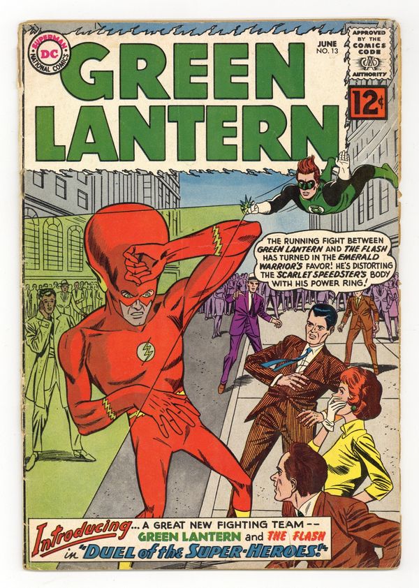 Ended May 26 2025 Winning Bid $8 Cover pencils by Gil Kane, inks by Joe Giella. The Duel of the Super-Heroes!, script by John Broome, pencils by Gil Kane, inks by Joe Giella; When Green Lantern exceeds the speed of light he crashes on the extra-dimensional planet of Spectar; The aliens there brainwash him and send him to Earth to capture the Flash; 1st Green Lantern and Flash team up; They reveal their identities to each other for the first time. 36 pgs. $0.12. Cover price $0.12. Grade: PR 0.5 explanation of grade Condition: Used (collectible)