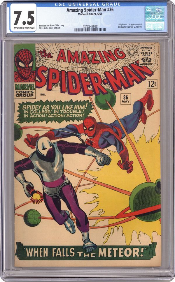Cover by Steve Ditko. When Falls the Meteor!, script by Steve Ditko (plot) and Stan Lee (script), art by Steve Ditko; A strange meteor gives Norton Fester incredible strength and agility. He uses these new powers to become the Looter to fund his scientific research. Reprinted in Marvel Tales # 28 and 175. 36 pgs., full color. $0.12. Cover price $0.12. Grade: CGC 7.5 explanation of grade Condition: Used (collectible)