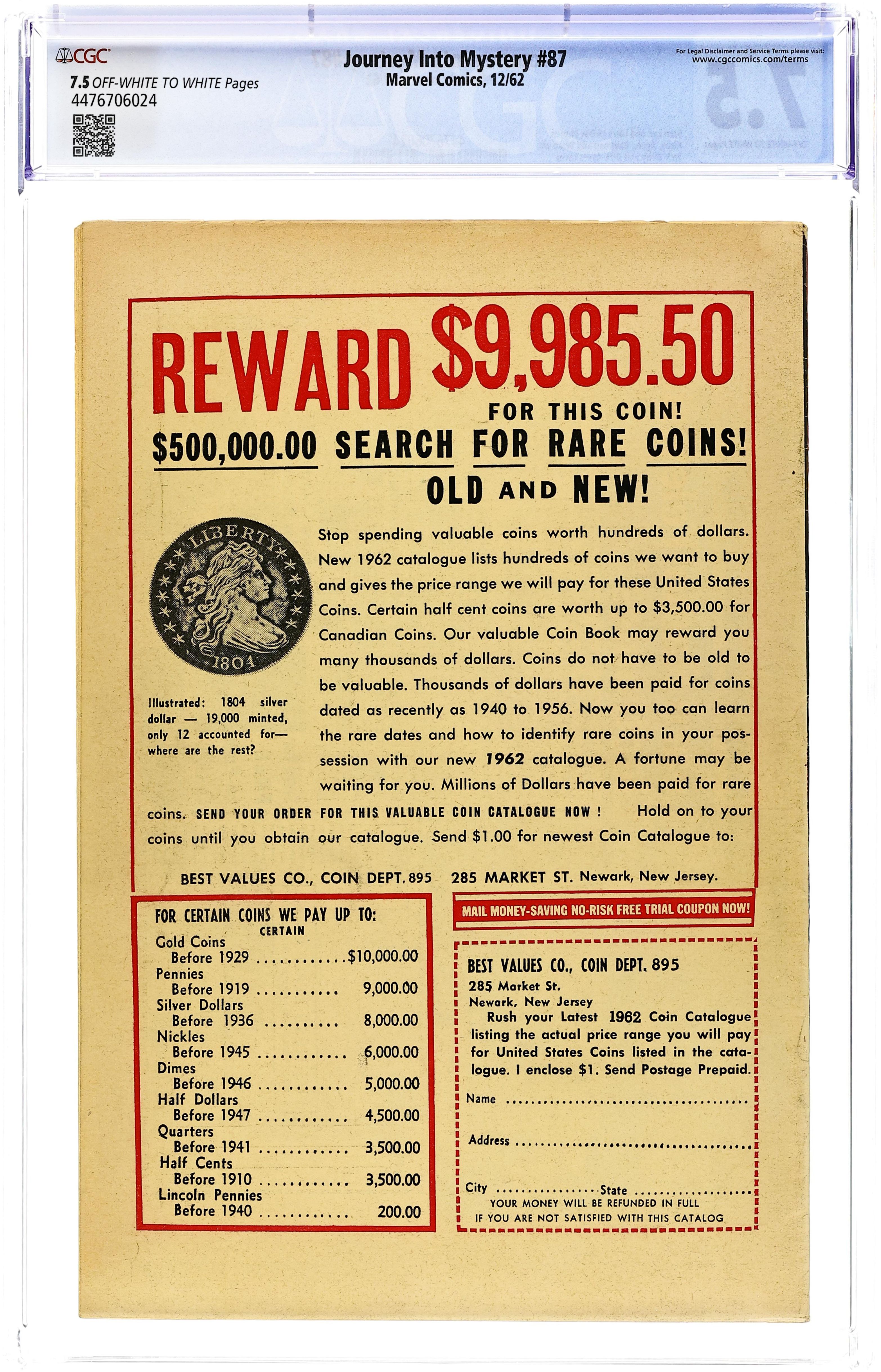 Tags: Marvel Legacy Numbering: Thor (part 87), ThorThor (1962 Marvel 1st Series Journey Into Mystery) 87 CGC 7.5