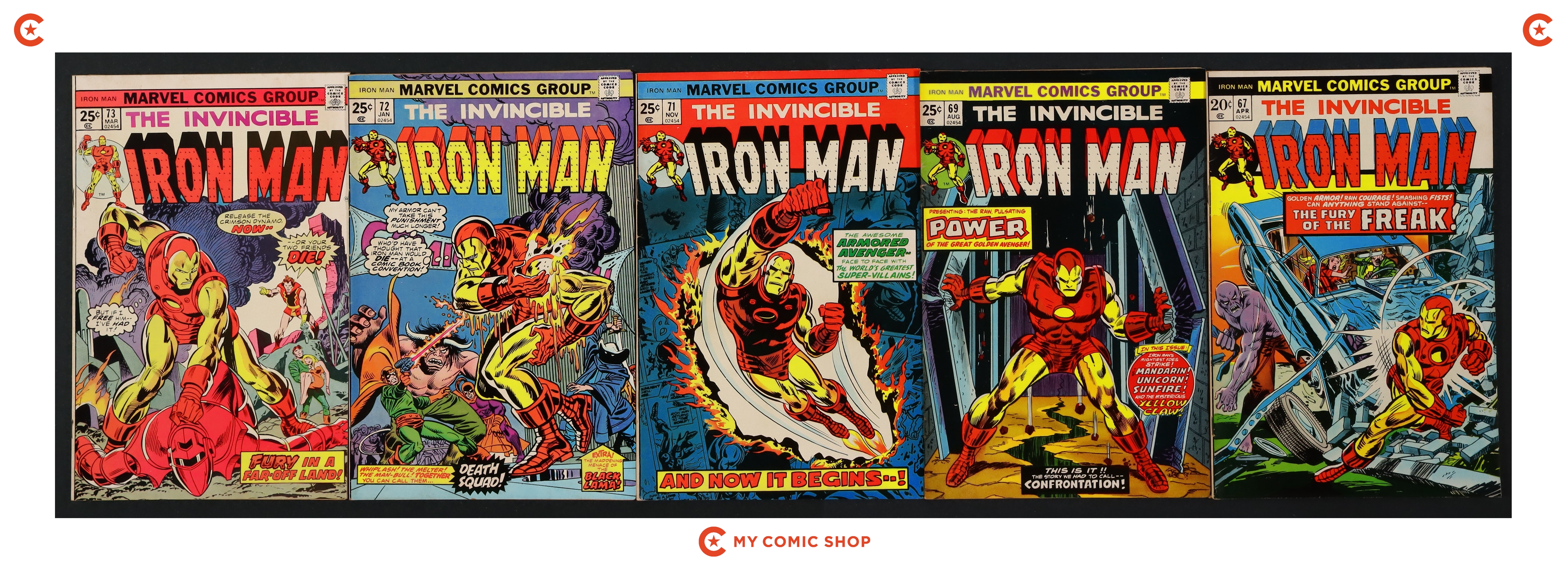 Issues 67, 69, 71-75 of Iron Man (1968 1st Series). Most will grade in the FN/VF range.
