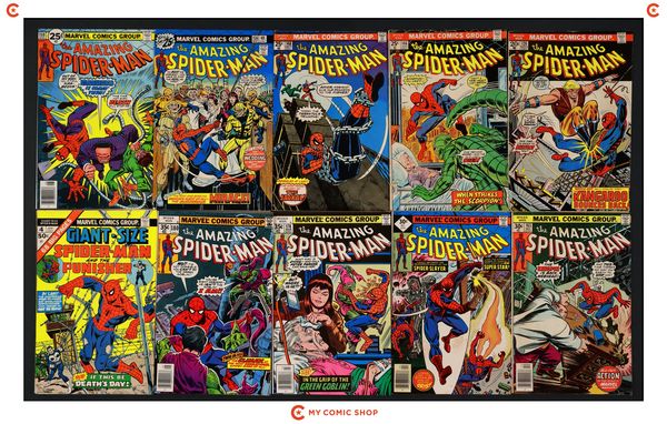 Issues 163, 186, 187, 189, 191, 193D, 195D, 196D, 198N, and 199D of Amazing Spider-Man (1963 1st Series). Most will grade in the VF range with #163 and #187 grading VG.