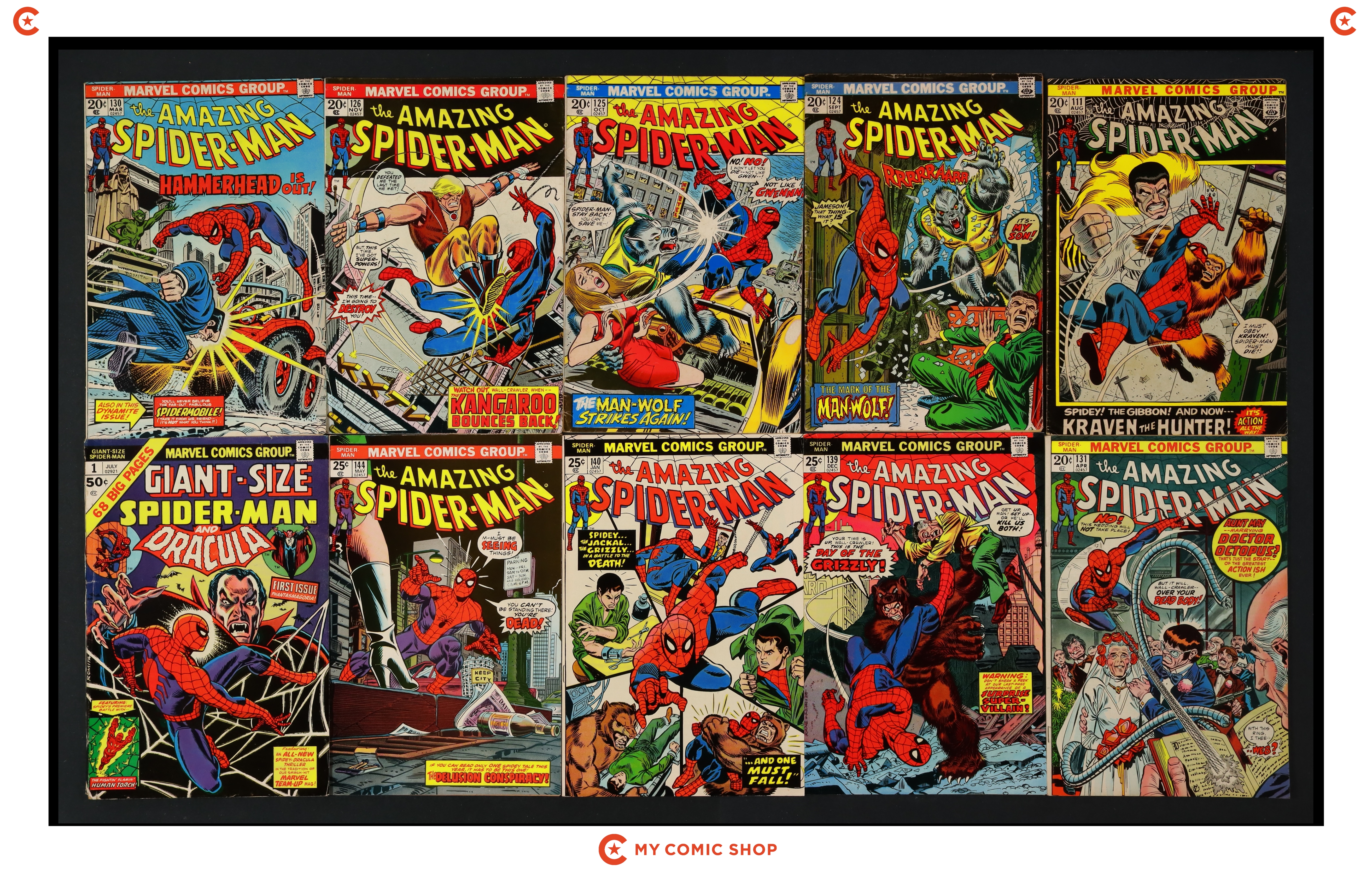 Issues 111, 124, 125, 126, 130, 131, 139, 140, and 144 of Amazing Spider-Man (1963 1st Series); and Giant Size Spider-Man (1974). Most will grade in the FN to VG range with #126 grading PR (piece missing, affects story and art), and #130 and #131 grading FR (missing Marvel Value Stamp).