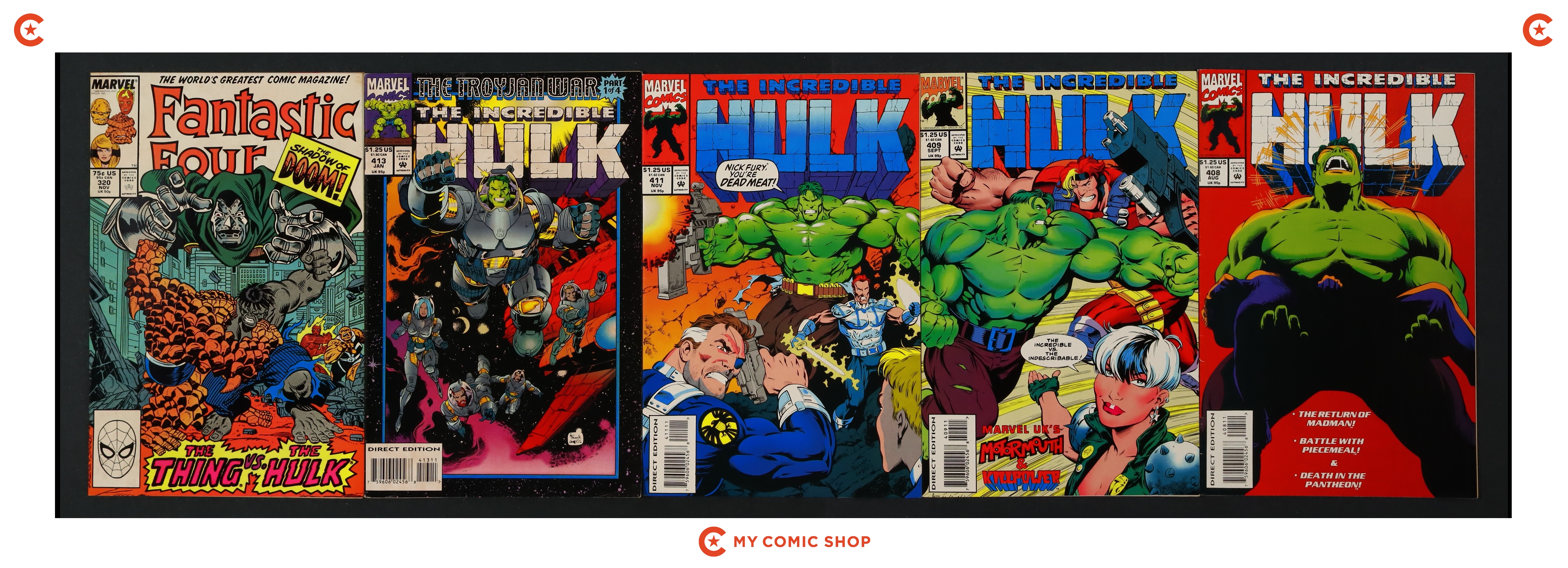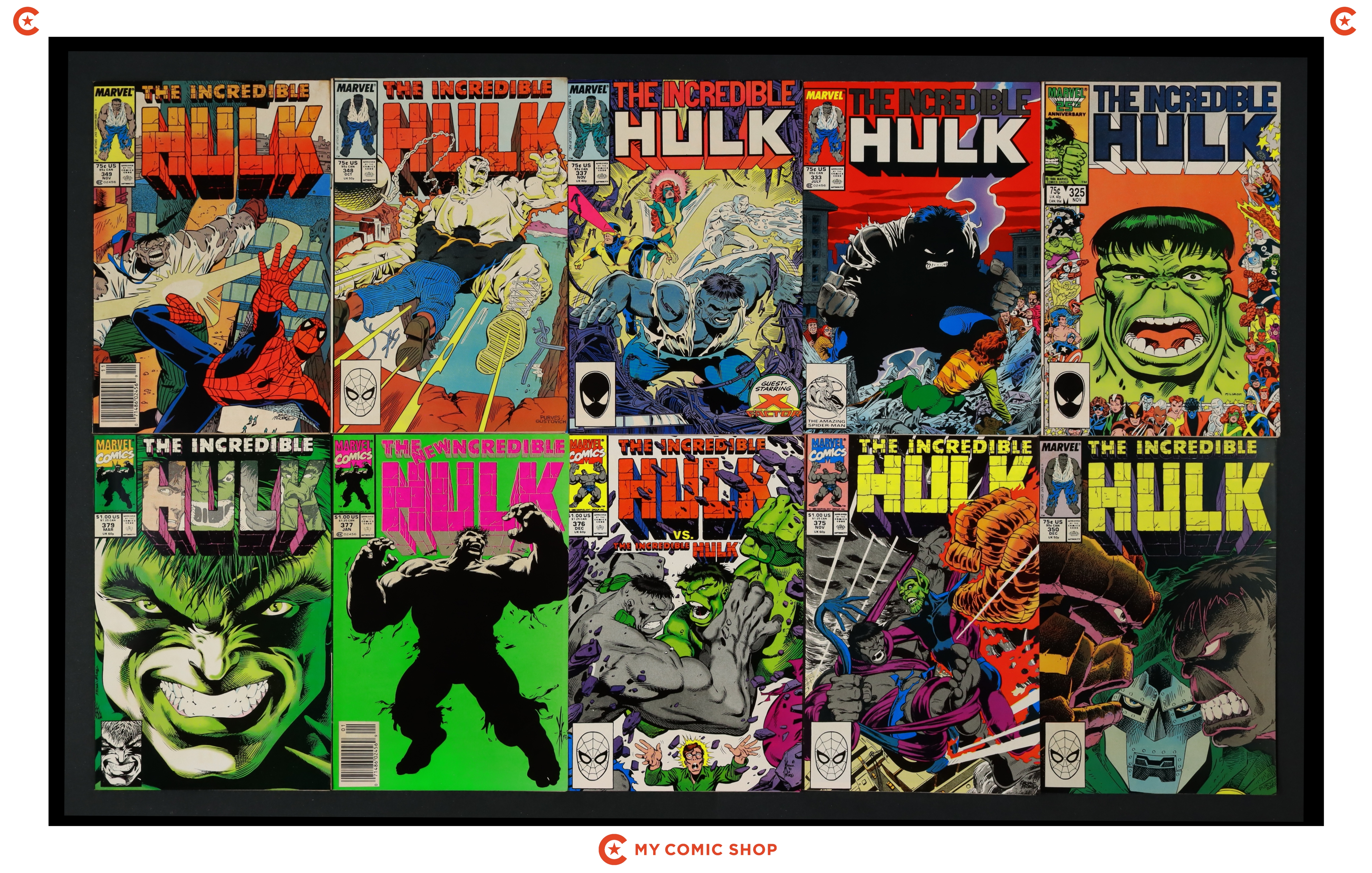 Issues 325, 333, 337, 348-350, 375-377, 379, 408, 409, 411, and 413 of Incredible Hulk (1962 Marvel 1st Series); and 320D of Fantastic Four (1961 1st Series). Most will grade in the FN range with a few grading VF.