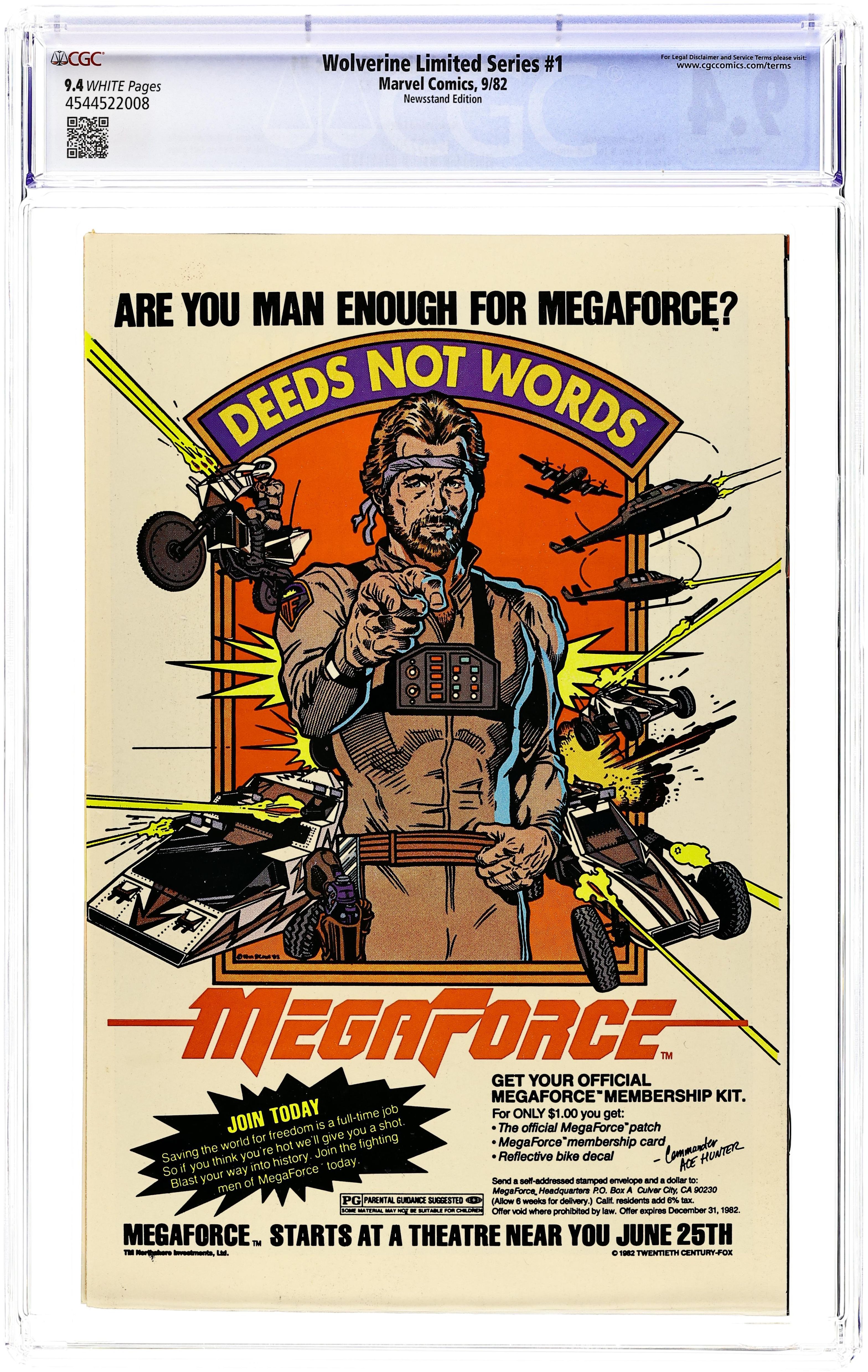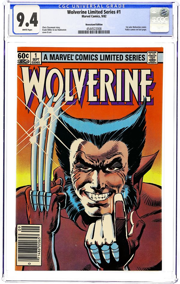 Ended May 9 2025 Winning Bid $195 Newsstand Edition. 1 of 4 Featuring Wolverine in his first solo series fighting in Japan. "Wolverine." Script by Chris Claremont, pencils by Frank Miller, inks by Joe Rubinstein. Miller/Rubinstein cover. Back cover MegaForce ad with art by William Stout. Cover price $0.60. Grade: CGC 9.4 explanation of grade Condition: Used (collectible)
