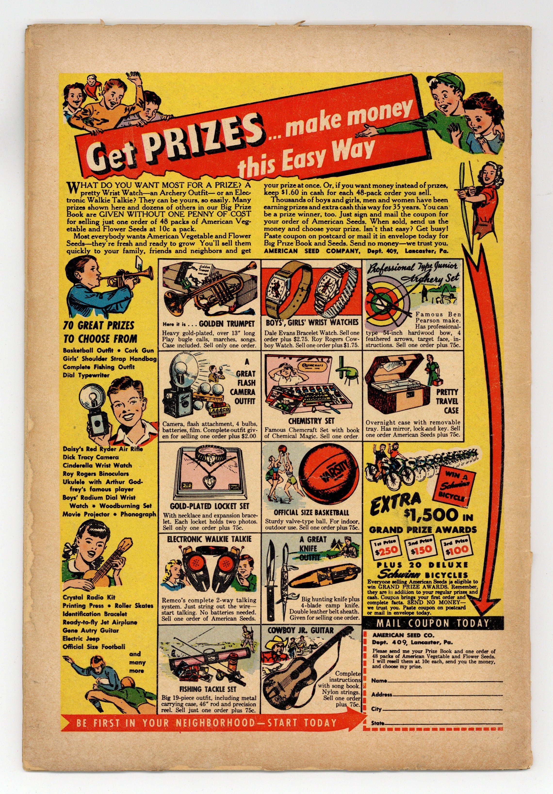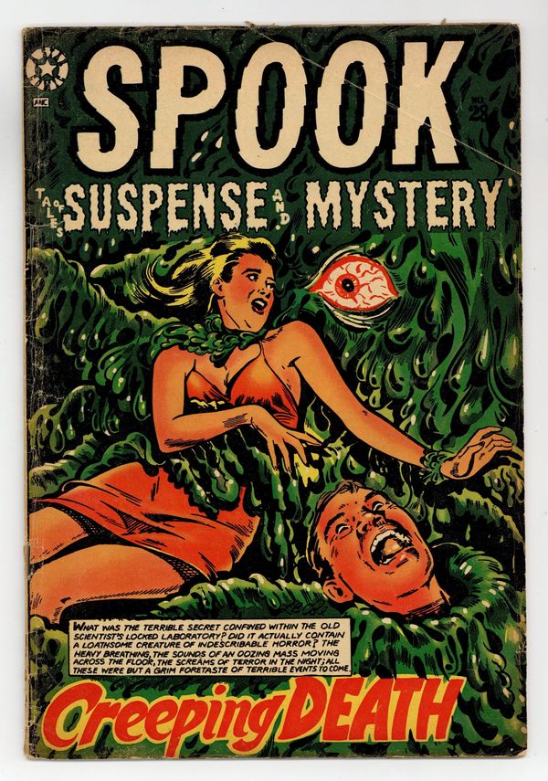 Cover by L. B. Cole. Stories and art by Jay Disbrow and George Appel. Pre-Code horror comics from L. B. Cole's Star Publications. In one of the all-time classic lab accidents, an amoeba gains massive size and intelligence, and runs amuck in the city. Red Rocket discovers a plot to replace human babies with Martian mutants. Amazo enslaves a village and battles jungle hero Rulah, but falls afoul of her own superstition, featuring art possibly by good-girl art legend Matt Baker. Creeping Death; Death Dance; Red Rocket: The Monstrous Madmen; Rulah: Jade of Death. 36 pages, full color. Cover price $0.10. Grade: GD 2.0 explanation of grade Condition: Used (collectible)