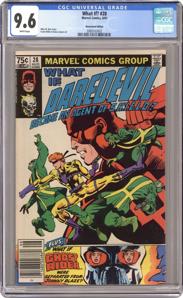 Ended May 6 2025 Winning Bid $41 Newsstand Edition. Cover pencils by Frank Miller, inks by Klaus Janson. "What If Ghost Rider Were Separated from Johnny Blaze?", script by Michael Fleisher, art by Tom Sutton; The Ghost Rider is taken over by a sorcerer and Blaze must stop him; Based on Ghost Rider #43-44. "Matt Murdock, Agent of...S.H.I.E.L.D.", script by Frank Miller (co-plot) and Mike W. Barr, pencils by Frank Miller, inks by Klaus Janson; After gaining his powers, Matt Murdock is recruited into SHIELD and has to save his dad from Hydra. Dungeons and Dragons ad. "New Life," script by Mark Gruenwald, pencils by Ron Wilson (breakdowns) and Bruce Patterson (finished art), inks by Bruce Patterson; Conclusion of Eternals history. "Wonders of Nature" ad for Hostess Fruit Pies featuring the Fantastic Four. 52 pgs. Cover price $0.75. Grade: CGC 9.6 explanation of grade Condition: Used (collectible)
