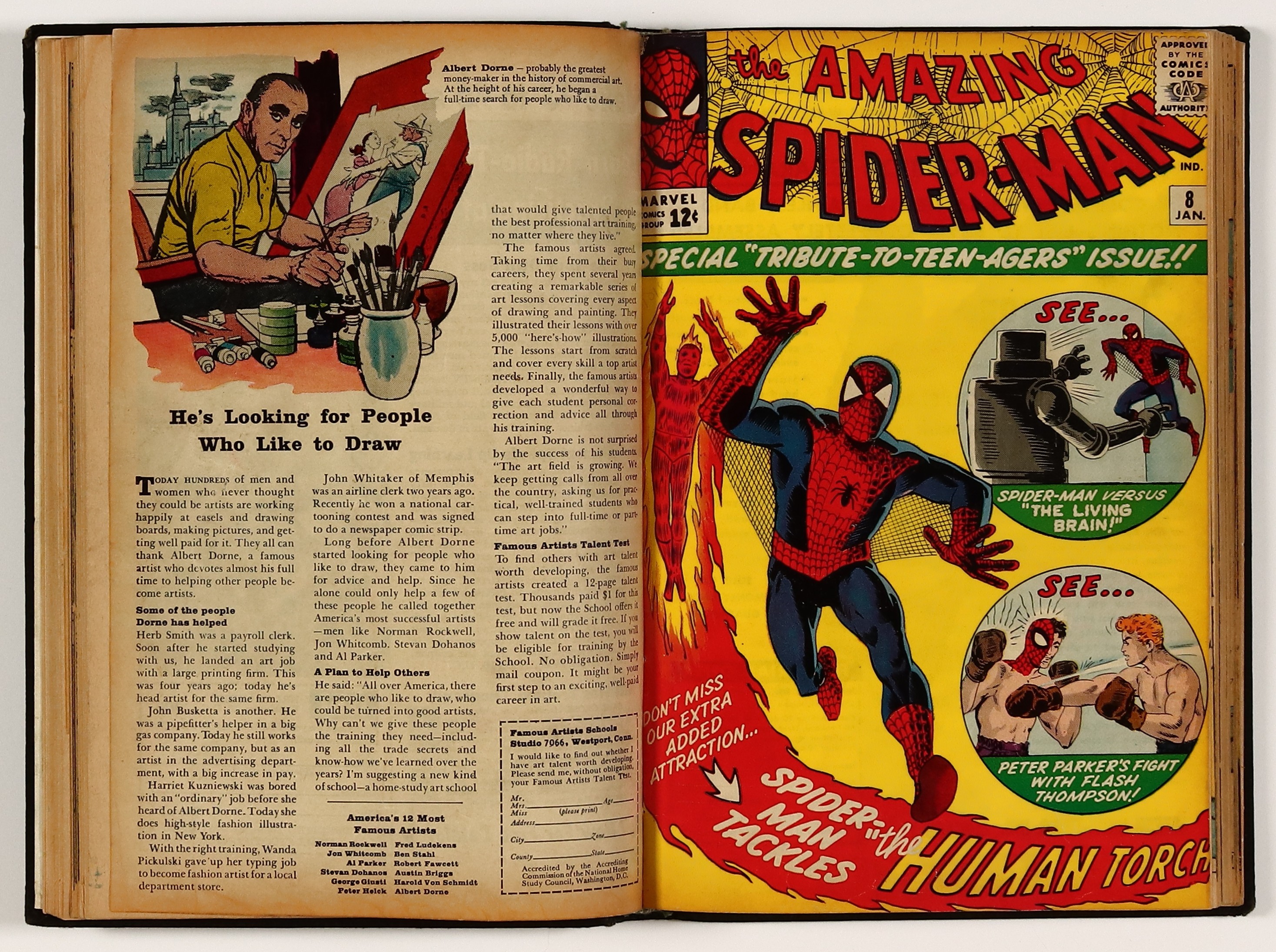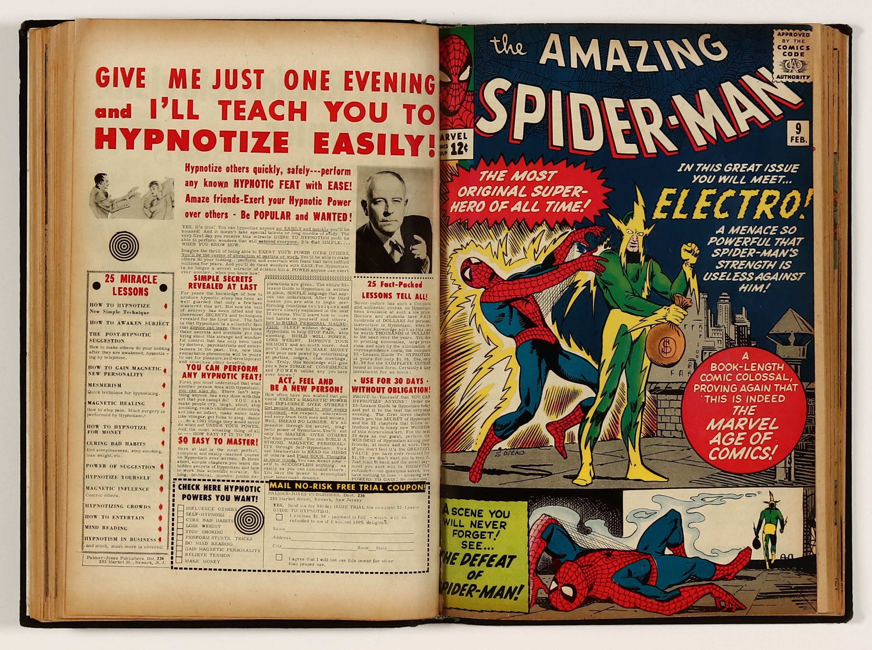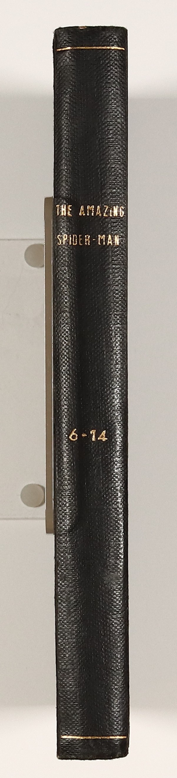 Post-manufacturer hardcover bound volume including issues 6-14 of Amazing Spider-Man (1963 1st Series). Comics inside are trimmed, sewn, and glued for binding, grading mostly in VG range otherwise; issue 6 grades closer to FR, and one centerfold is detached. Includes a taped-in typed insert of basic story content with personalized stamps. Outer spine is labeled "The Amazing Spider-Man 6-14".