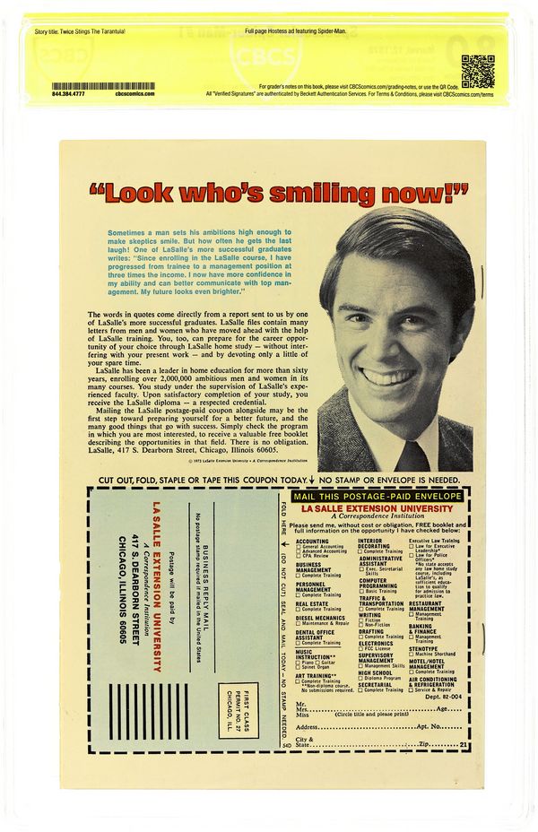 Ends Dec 8 9:23 PM CST Bid History 6 bids Current Bid $45 Your Secret Max Bid If you'd like to bid, please log in or register. "Twice Stings The Tarantula!" Part 1 of 3. Script by Gerry Conway. Pencils by Sal Buscema. Inks by Mike Esposito. Cover by Sal Buscema and John Romita. The first issue of a brand new series for Spider-Man! The story opens with a bang as the Tarantula kidnaps the Empire State University vice-chancellor, despite the best efforts of the web-slinger, Flash Thompson, and Mary Jane Watson! Next, the Tarantula tries to kill the mayor, but this time the Spectacular Spider-Man is ready! Can the wall-crawler beat the Tarantula and save Mayor Abe Beame? First appearance of Edward Lansky (aka Lightmaster). (Notes: The Spectacular Spider-Man series became the third monthly title for Spider-Man. The first issue of the series debuted the same month as Amazing Spider-Man 163 and Marvel Team-Up 52. The letters page contains an essay from Gerry Conway describing the plans for the new Spider-Man title.) 32 pages Cover price $0.30. Grade: CBCS 8.0 explanation of grade Condition: Used (collectible)