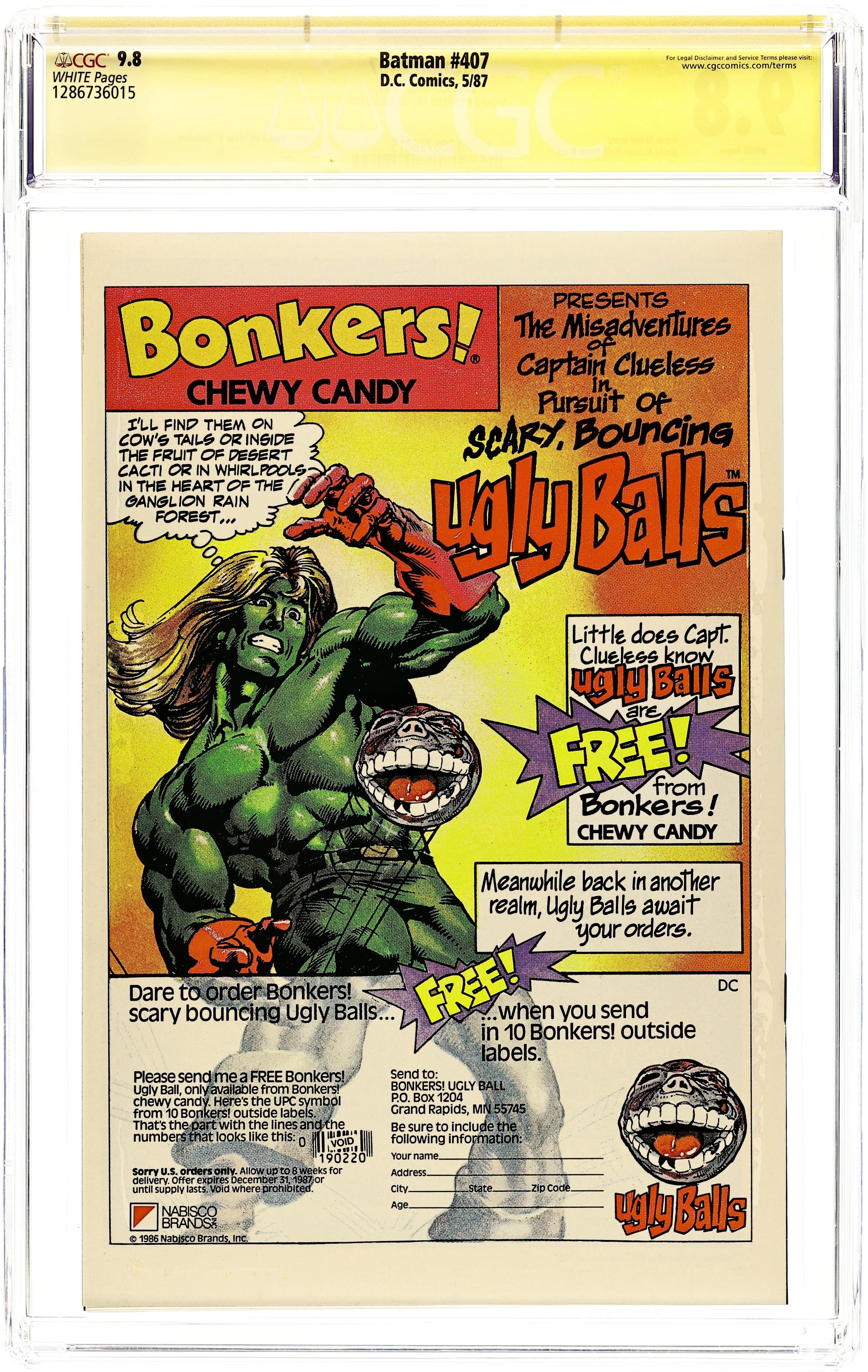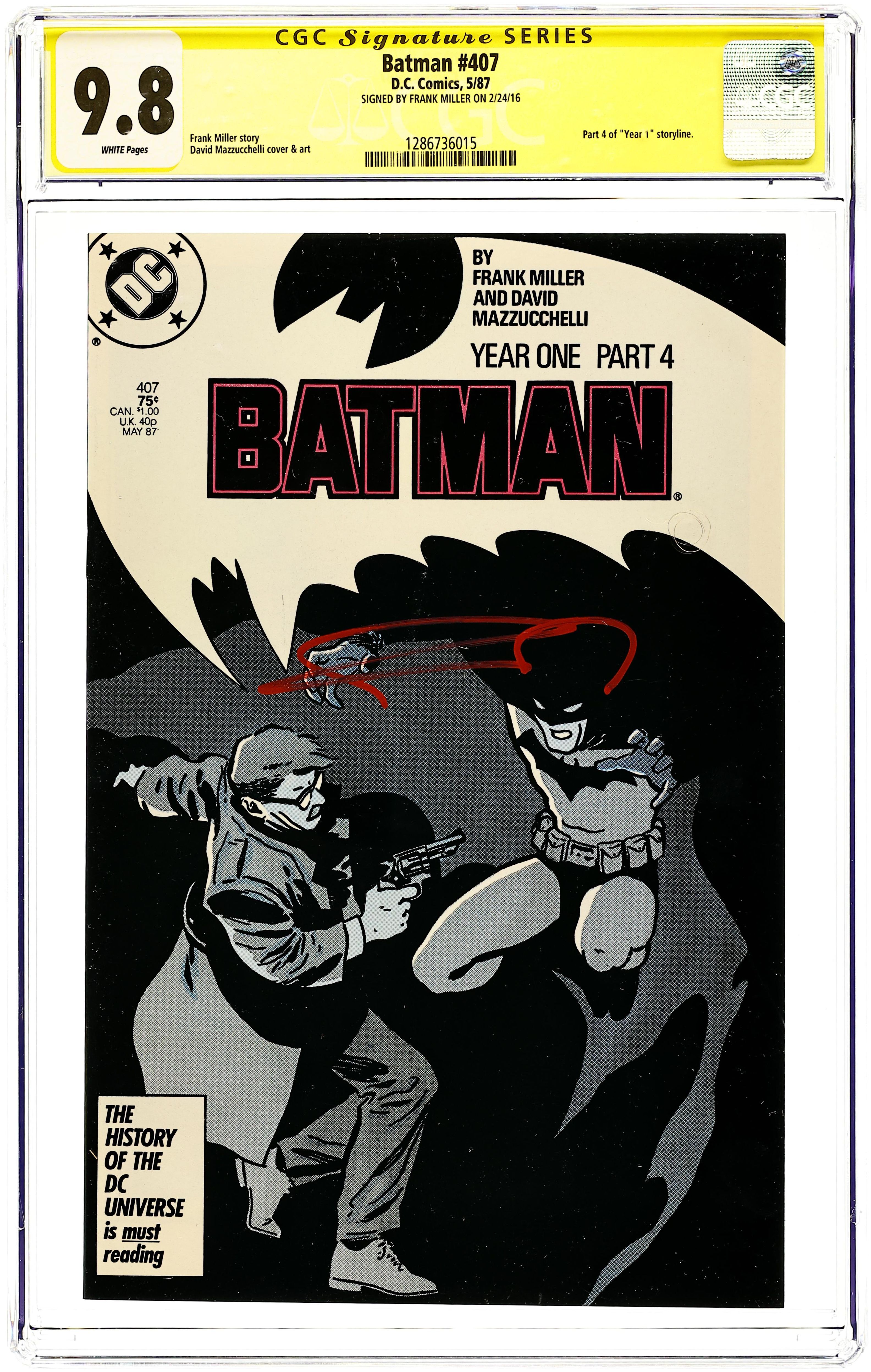 Batman Year One, Chapter Four: "Friend In Need". Part 4 of 4, continued from the previous issue. James Gordon is blackmailed, Catwoman gets in Batman's way and Bruce Wayne must come to the rescue sans cape and cowl. Script by Frank Miller, art by David Mazzucchelli. Mazzucchelli cover. 1st printing. NOTE: Most issues from 397-432 were reprinted in 1989 and sold in multipacks. These 2nd and 3rd prints have back cover ads dated 1989. 36 Pages, Full Color. Cover price $0.75. Grade: CGC 9.8 explanation of grade Condition: Used (collectible)