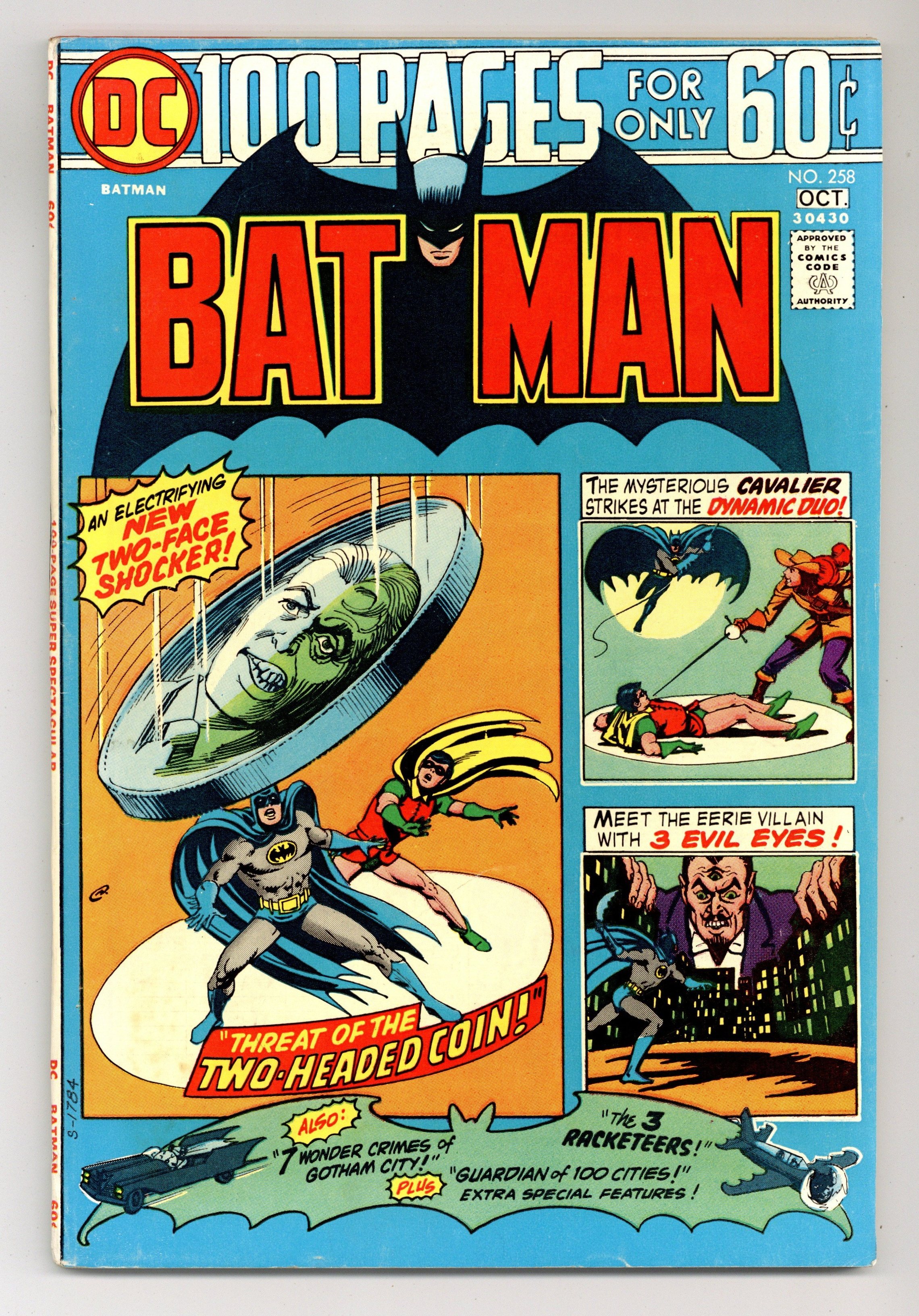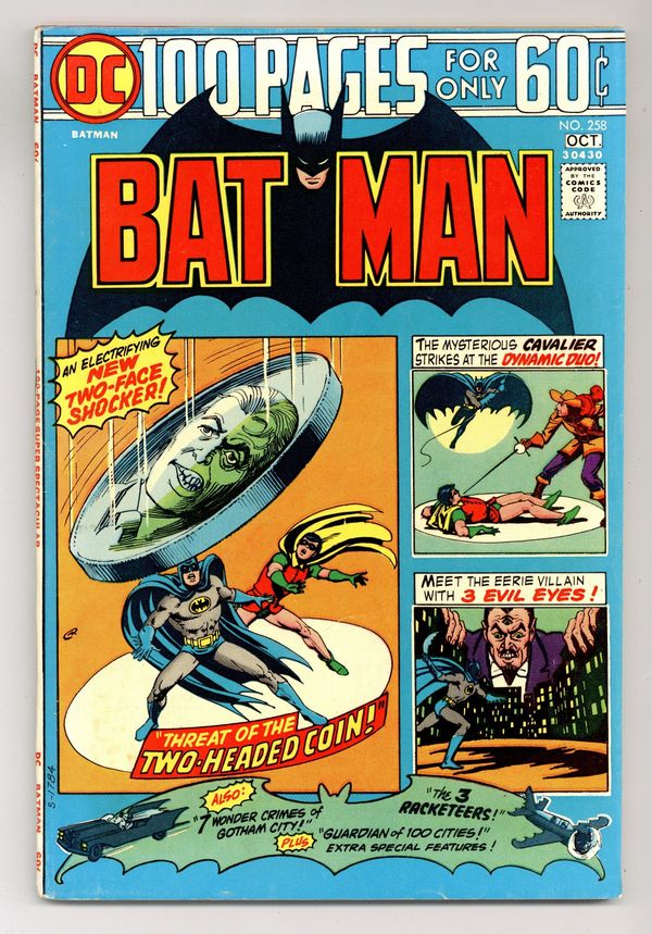 Ended May 12 2025 Winning Bid $36 100-page giant. Cover by Nick Cardy. Two-Face is back in a new story, "Threat of the Two-Headed Coin!", script by Denny O'Neil, pencils by Irv Novick, inks by Dick Giordano; Two-Face returns, having devised a plan to extort $2 billion from the citizens of the U.S.; If the government refuses to pay, the criminal plans to destroy the government...forever! Bat-Puzzle activity page by Bob Rozakis, pencils by Carmine Infantino, inks by Murphy Anderson. "The Three Racketeers!", script by Bill Finger, pencils by Bob Kane, inks by Jerry Robinson and George Roussos; Three former racketeers sit about a table playing cards in prison discussing how the Batman and Robin brought their dreams of easy wealth to a disastrous end. "7 Wonder Crimes of Gotham City!", script by Gardner F. Fox, pencils by Sheldon Moldoff (as Bob Kane), inks by Joe Giella; The Dynamic Duo face an opponent out to commit the "Seven Wonder Crimes of Gotham City." "Twenty-Ton Robbery!", script by Don Cameron, art by Dick Sprang (as Bob Kane); The Cavalier returns in disguise to acquire a new mob that he plans to use to rob the city blind, but the theft of a whale undoes his plans. "The Guardian of 100 Cities!" script by Bill Finger, pencils by Sheldon Moldoff, inks by Charles Paris; Famed replica artifacts from various movie sets, located in a field not far from Hollywood, serve as the stage as a hideout for escaped convict Shag Darnell and his thugs. "The Man with a Thousand Eyes!", script by Bill Finger, pencils by Bob Kane, inks by Charles Paris; Count Florian, a criminal Batman and Robin once battled in London, comes to America and successfully steals a civilian invention in order to spy on America. 100 Pages, Full Color. Cover price $0.60. Grade: VG+ 4.5 explanation of grade Condition: Used (collectible)