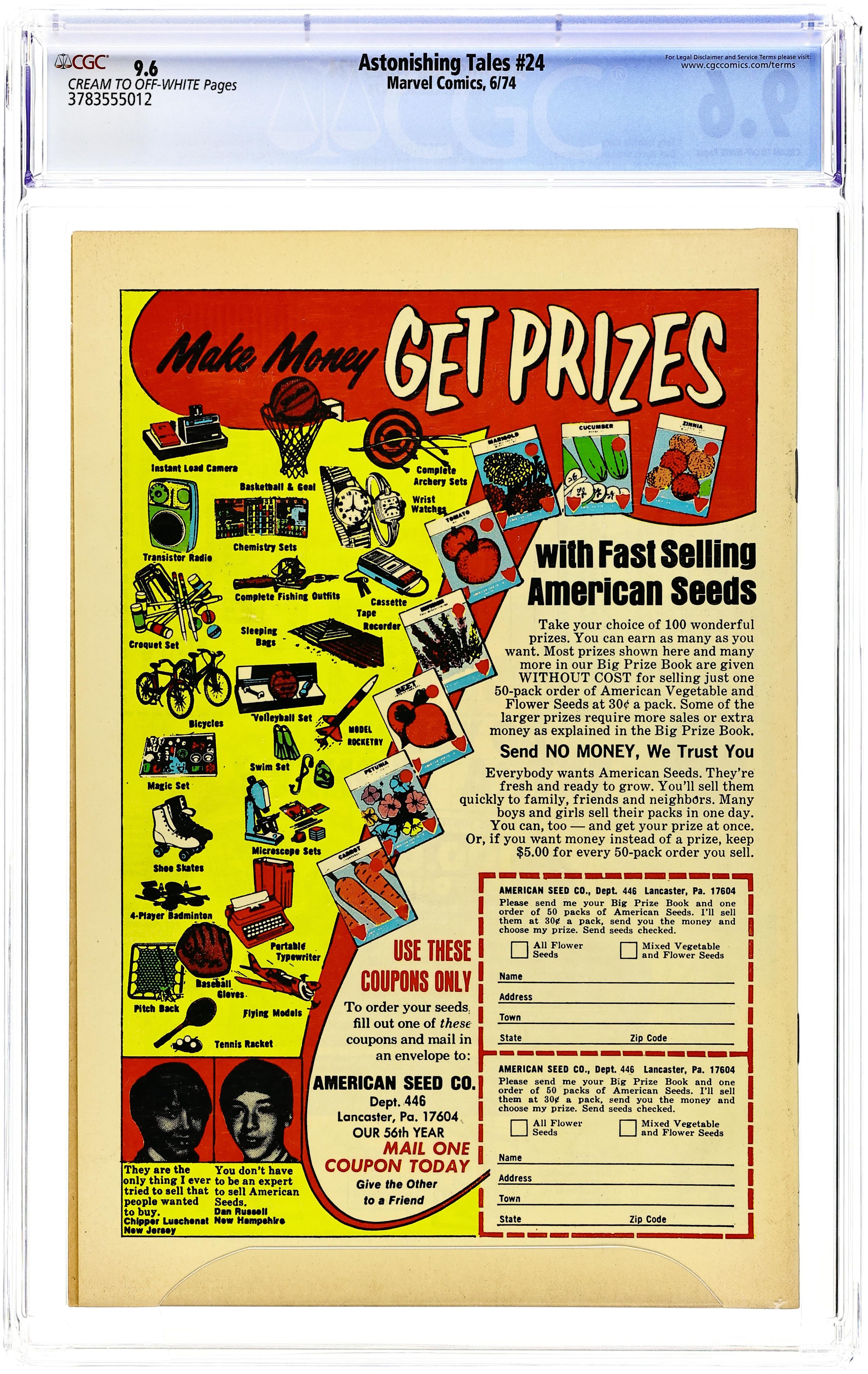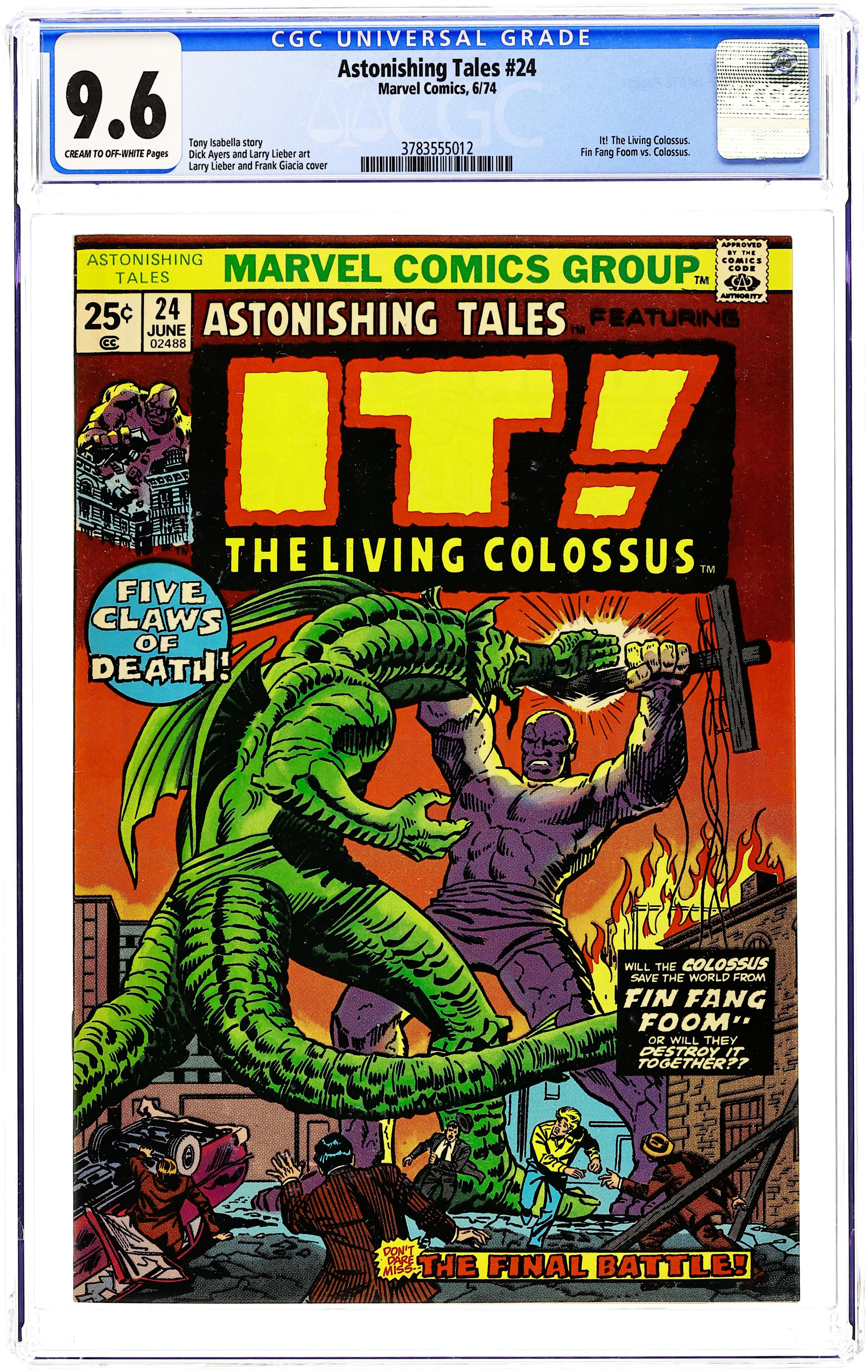 Ended May 12 2025 Winning Bid $145 First 25-cent cover price. Cover pencils by Larry Lieber, inks by Frank Giacoia. Five Claws of Death!, script by Tony Isabella, pencils by Dick Ayers, Larry Lieber, Jack Kirby (reprinted material), and Gil Kane (reprinted material), inks by Vince Colletta, Dick Ayers (reprinted material), and Mike Esposito (reprinted material); Fin Fang Foom is again controlled by Dr. Vault and he attacks It forcing him to slip away before he is defeated; Bob O'Bryan then sends his mind back to his body where he wakes up before they can perform an autopsy on him. Advertisement for three official Marvel Solid-Bronze Collectors Medallion-Coins. Stan Lee's Soapbox. Promo for Crazy Magazine #4 and Savage Tales #4. 32 pgs. $0.25. Cover price $0.25. Grade: CGC 9.6 explanation of grade Condition: Used (collectible)