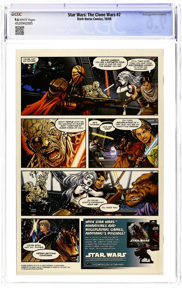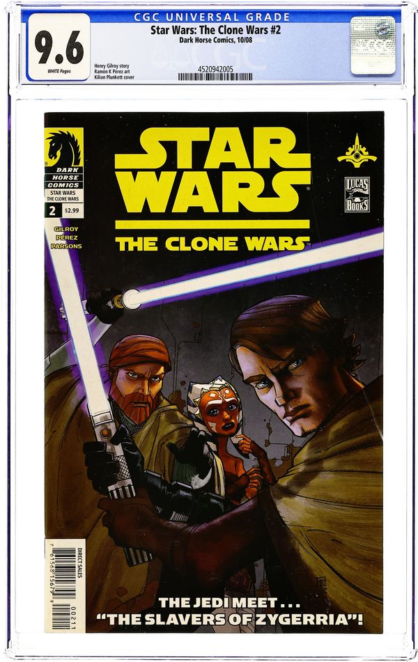 Written by Henry Gilroy. Art by Ramon K. Perez & Dan Parsons. Cover by Kilian Plunkett. Anakin Skywalker and Obi-Wan Kenobi have discovered the dastardly plot of Count Dooku: the entire population of the planet Kiros is in danger! Along with fresh new Padawan Ahsoka Tano, Anakin and Obi-Wan have liberated the droid-occupied planet and halted its destruction, but the native Togruta people have disappeared. Now, our Jedi must find the missing citizens, before Count Dooku can carry out his master plan! 36 pages, full color. Cover price $2.99. Grade: CGC 9.6 explanation of grade Condition: Used (collectible)