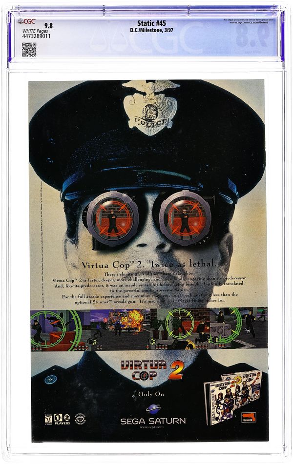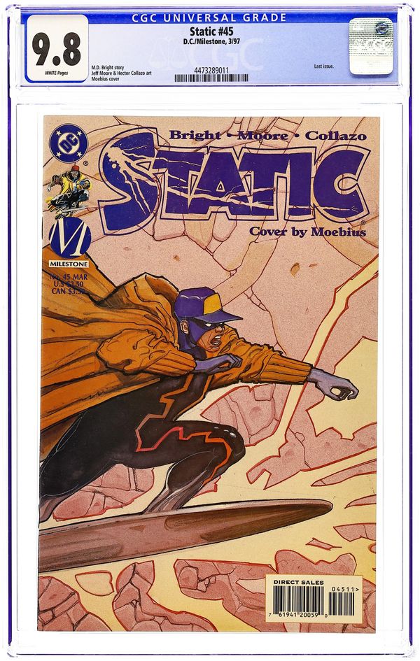 Ended May 13 2025 Winning Bid $395 Final issue. ...Gone - Written by M.D. Bright. Art by Jeff Moore and Hector Collazo. Painted cover by Moebius. A Milestone series. Static lays a trap for his swiftest adversary, Laserjet, and finds out that there is more to him than meets the eye! Meanwhile, a wave of petty crimes and thuggery at Hemingway High forces Frieda, Virgil and friends to adopt creative methods of protecting themselves. They learn that crime does not pay, but being the victim really stinks! This issue has a special cover painted by the legendary Moebius. Fracote Format. 32 pages, full color. Cover price $2.50. Grade: CGC 9.8 explanation of grade Condition: Used (collectible)