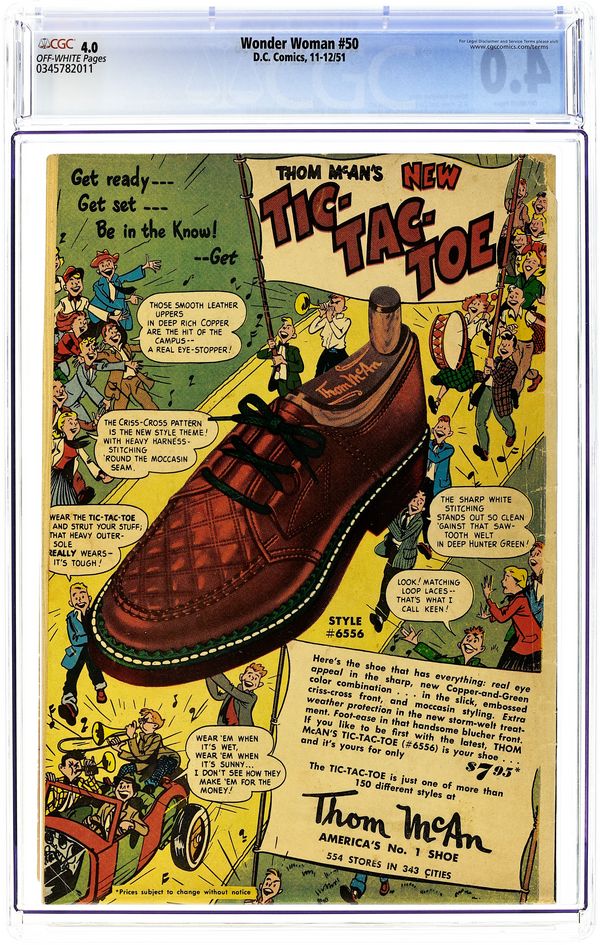 Wonder Woman stars in "Menace of the Master Spy" and "The Secret Story of Wonder Woman's Lasso!" Art by Harry G. Peter? Wonder Women of History: two-page Ellen Swallow Richards. Romance, Inc. story, "Heartbreak for Amy!" Superman stars in a one-page public service announcement, "The World is Our Schoolroom!" 44 Pages, Full Color. Cover price $0.10. Grade: CGC 4.0 explanation of grade Condition: Used (collectible)