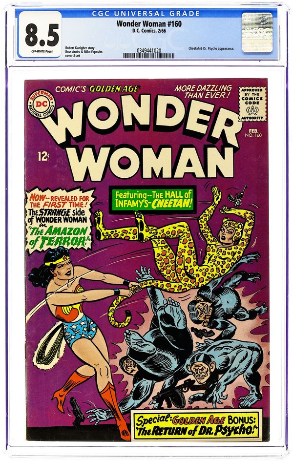Ended Oct 15 2025 Bid History 23 bids Winning Bid $589 Cover pencils by Ross Andru, inks by Mike Esposito. "The Amazon of Terror," script by Robert Kanigher, pencils by Ross Andru, inks by Mike Esposito; Wonder Woman and Steve Trevor stop the Cheetah and her gang from robbing a zoo of its priceless extinct animal exhibit for a client; But the Cheetah escapes, and later hypnotizes Trevor into smooching with her; When Wonder Woman sees them, as the Cheetah had planned, she is tear-stricken and upset, allowing the villainess to take her by surprise, steal her magic lasso, and encircle her with it; Wonder Woman, enslaved by the Cheetah, is forced to take her and Steve to the Cheetahs private island. "Dr. Psycho's Revenge," script by Robert Kanigher, pencils by Ross Andru, inks by Mike Esposito; To show Athena and Aphrodite that Wonder Womans beauty and wisdom, derived from goddesses, are nothing compared to the god-derived powers of strength and speed she possesses, Mars steals her Herculean strength and Mercurian speed temporarily and gives them to the woman-hating Dr. Psycho, who has been rejected by all women as a suitor because of his ugliness. 36 pages, Full Color. Cover price $0.12. Grade: CGC 8.5 explanation of grade Condition: Used (collectible)