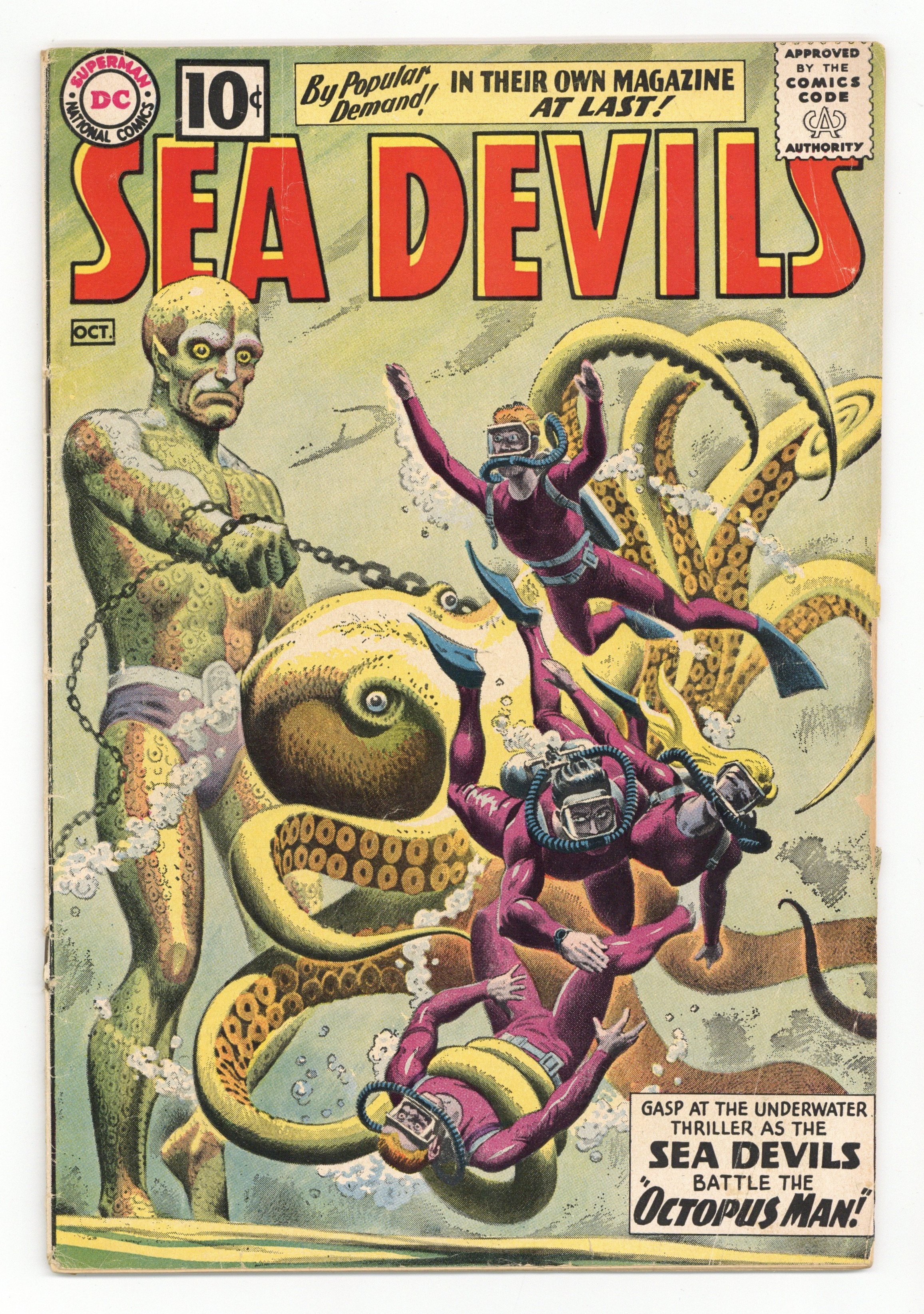 Ended Apr 28 2025 Winning Bid $68 Cover by Russ Heath. "The Sea Devils vs. the Octopus Man!", script by Robert Kanigher, art by Russ Heath; Producer Wendel Wales is shooting a movie about the Sea Devils; His mechanical Octopus Man is destroyed when the real version appears and attacks the movie set. "Secret of the Emerald Whale!", script by Bob Haney, art by Russ Heath; The Sea Devils find an iceberg with the Emerald Whale and Captain Shark frozen inside. 36 pgs., full color. $0.10. Cover price $0.10. Grade: GD+ 2.5 explanation of grade Condition: Used (collectible)