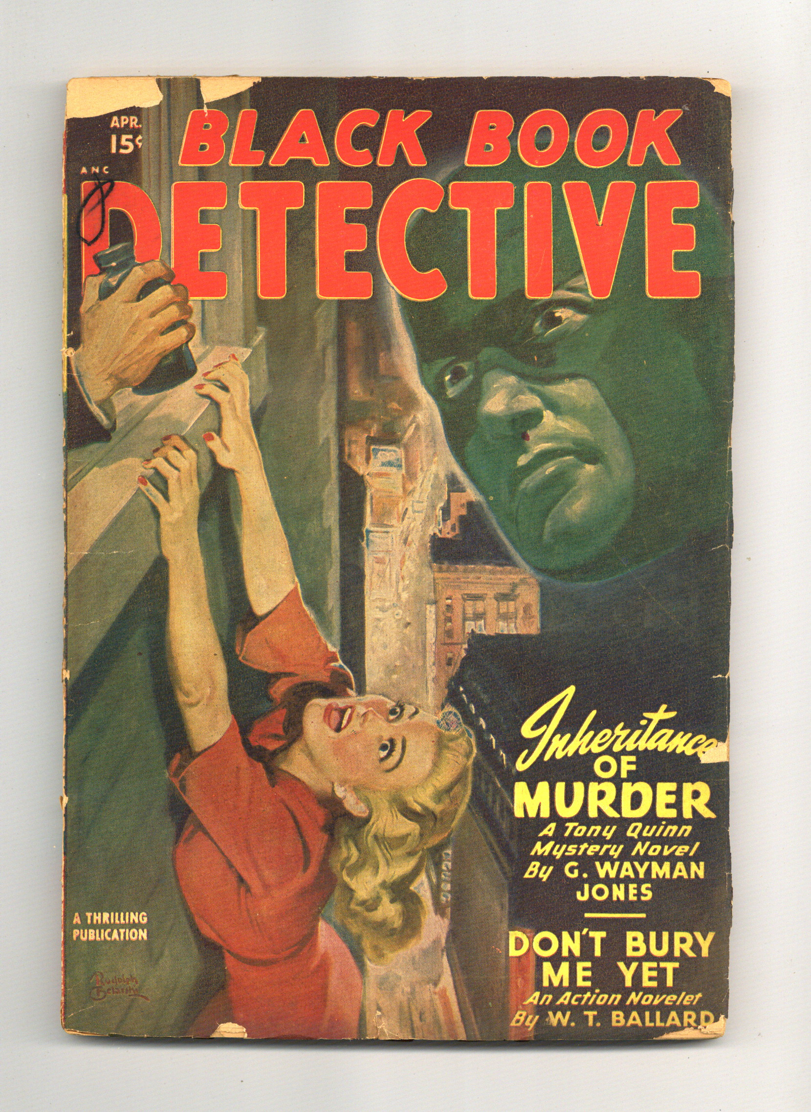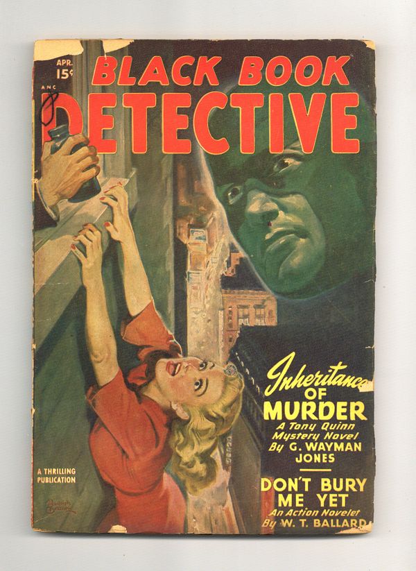 The Black Bat in "Inheritance of Murder" by "G. Wayman Jones" (Norman Daniels); "Don't Bury Me Yet" by W.T. Ballard; "The Frightened Comedian" by Jack Kofoed; "The Brass Ring" by Donald Bayne Hobart; "Call for a Murderer" by John L. Benton; and "The Lying Corpse" by Wayland Rice. Pulp magazine format; black and white; 112 newsprint pages. Cover price $0.15. Grade: Good explanation of grade Condition: Used (collectible)