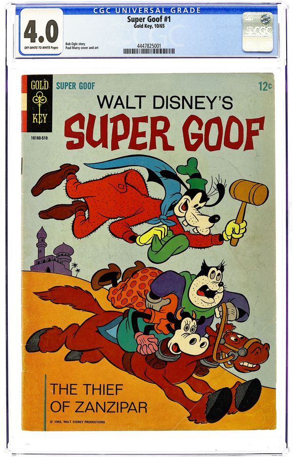 Ended May 8 2025 Winning Bid $50 Written by Bob Ogle and unknown. Art and Cover by Paul Murry. Super Goof stars in "The Thief of Zanzipar" and "The Vanishing Zoo," plus two 1-page stories. Characters in this issue: Super Goof (first appearance), Goofy, Clarabelle Cow, Clara Cluck, Daisy Duck, Minnie Mouse, Mickey Mouse, Black Pete, Scuttle, Beagle Boys, Chief O'Hara and Huey. 32 pages, full color. Cover price $0.12. Grade: CGC 4.0 explanation of grade Condition: Used (collectible)