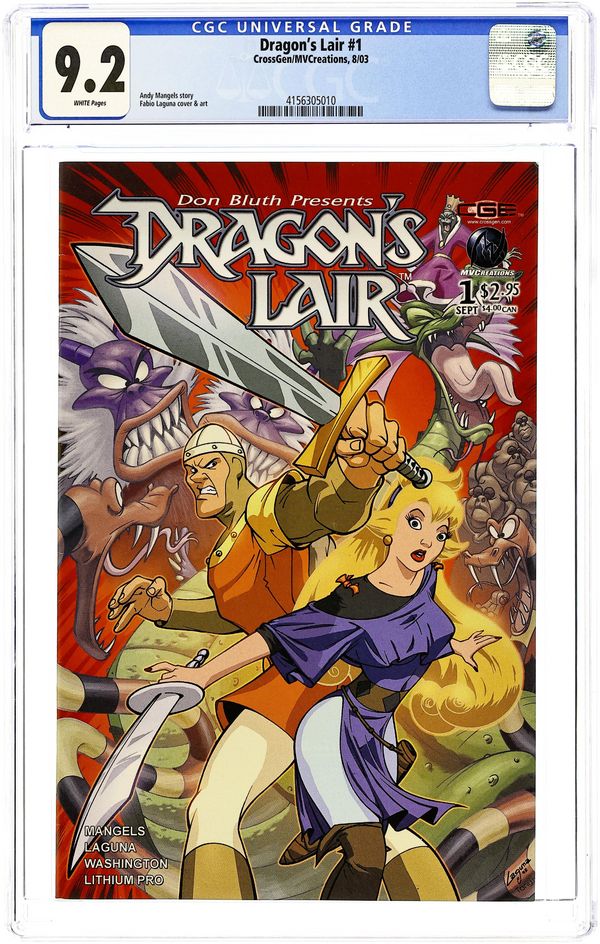 Andy Mangels (w), Fabio Laguna (p & i), Tony Washington (c) Celebrating the 20th Anniversary of Dragon's Lair, the stars of one of the top arcade games in history make their comic book debut! Swearing revenge on Dirk the Daring for killing his offspring, the deadly dragon Singe swoops up Princess Daphne in his razor- sharp claws! Now, armed with his courage and skills, our brave knight must survive the dangers of the Dark Kingdom to save his Princess! It's swordplay, sorcery, dragons, and damsels...plus a pinch of humor! Lead on, adventurer...your quest awaits! 32 pgs, full color, on sale August 6 $2.95 Cover price $2.95. Grade: CGC 9.2 explanation of grade Condition: Used (collectible)