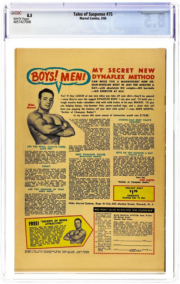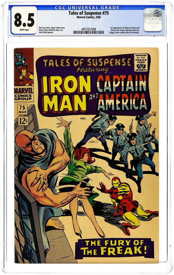 Ended Jul 17 2025 Winning Bid $171 Cover pencils by Gene Colan, inks by Jack Abel. "The Fury of ... the Freak!", script by Stan Lee, pencils by Gene Colan (as Adam Austin), inks by Jack Abel (as Gary Michaels); When using the Enervation Intensifier device in order to heal Happy Hogan of his wounds, Iron Man accidentally transforms his friend and body guard into a horrible creature dubbed The Freak. 1st appearance of Sharon Carter (Agent 13) and Batroc the Leaper in "30 Minutes to Live!", script by Stan Lee, pencils by Jack Kirby (layouts) and Dick Ayers (pencils), inks by John Tartaglione; Cap tries to keep Batroc from getting his hands on a vial of Inferno 42. Ad for Fantasy Masterpieces #1. 36 pages, full color. Cover price $0.12. Grade: CGC 8.5 explanation of grade Condition: Used (collectible)