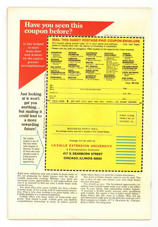 Cover pencils by Ross Andru, inks by Frank Giacoia. Death Stalks the City!, script by Steve Gerber, pencils by Bob Brown, inks by Vince Colletta; DD rescues Candice and Foggy from Death-Stalker but the villain escapes; DD combs the local chemical plants searching for Death-Stalker and, once he discovers him, ends up knocking him into a vat of hydrochloric acid; Black Widow guest appearance; cameos by the Gladiator and Man-Thing. The letters page contains Marvel Value Stamp series A #35 (Killraven by Herb Trimpe), and also an ad for Wolverine's debut in Incredible Hulk #181. 36 pgs. Cover price $0.25. Cover price $0.25. Grade: FN/VF 7.0 explanation of grade Condition: Used (collectible)