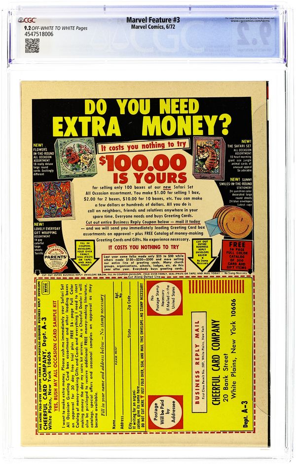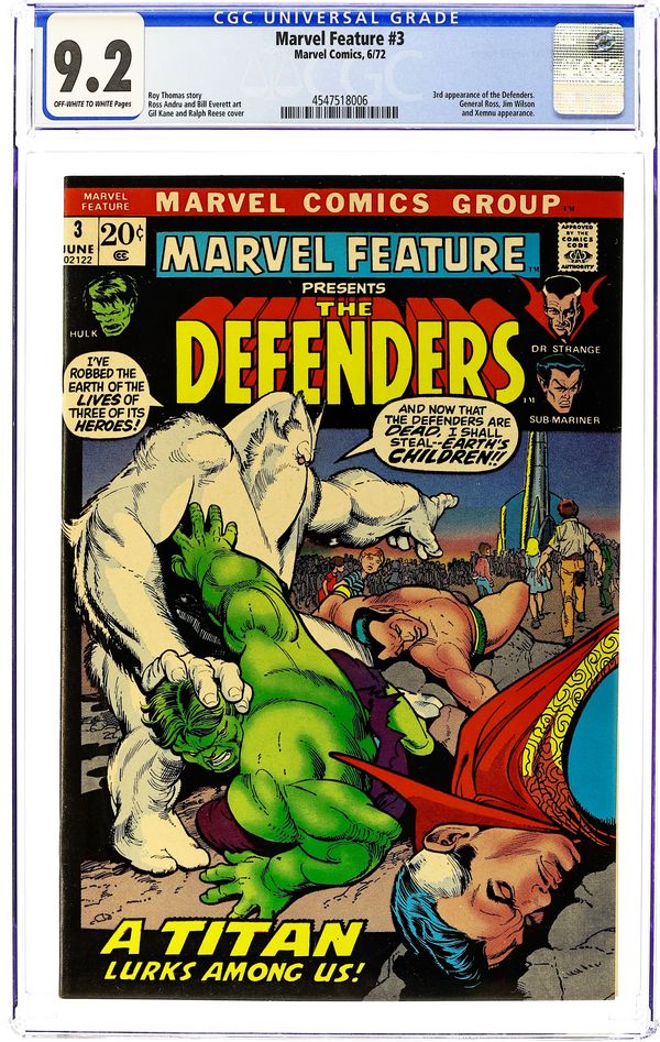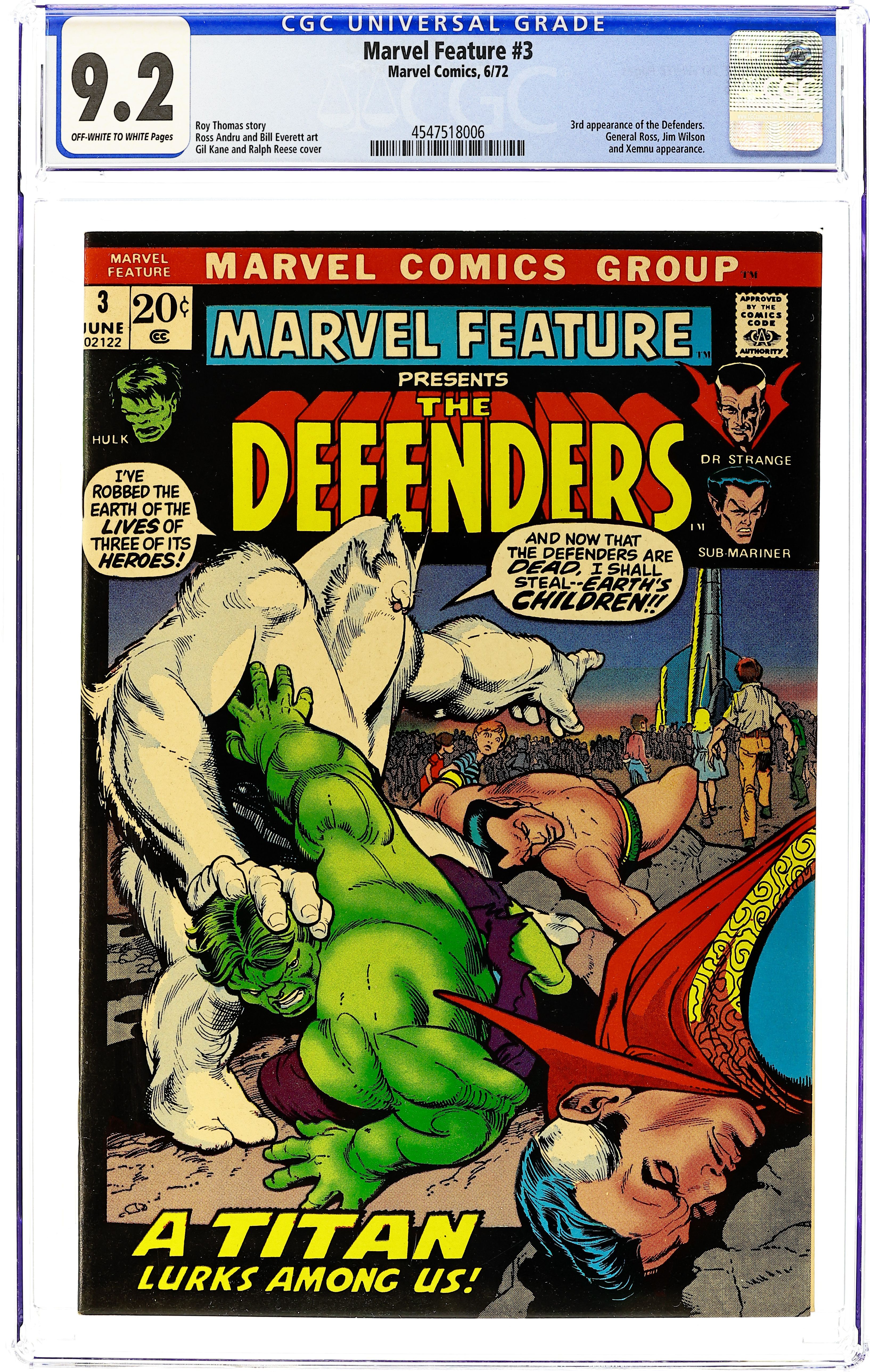 Cover pencils by Gil Kane, inks by Ralph Reese. "A Titan Walks Among Us!", script by Roy Thomas, pencils by Ross Andru, inks by Bill Everett; Alien conqueror Xemnu uses his mental powers, broadcast through a kids' television show, to try and enslave mankind; The combined forces of the Defenders must rise to stop him. Xemnu the Titan previously appeared in Monsters on the Prowl (Marvel, 1971 series) #11 and #14, reprints of Journey Into Mystery (Marvel, 1952 series) #62 and #66. 36 pgs., full color. $0.20. Cover price $0.20. Grade: CGC 9.2 explanation of grade Condition: Used (collectible)